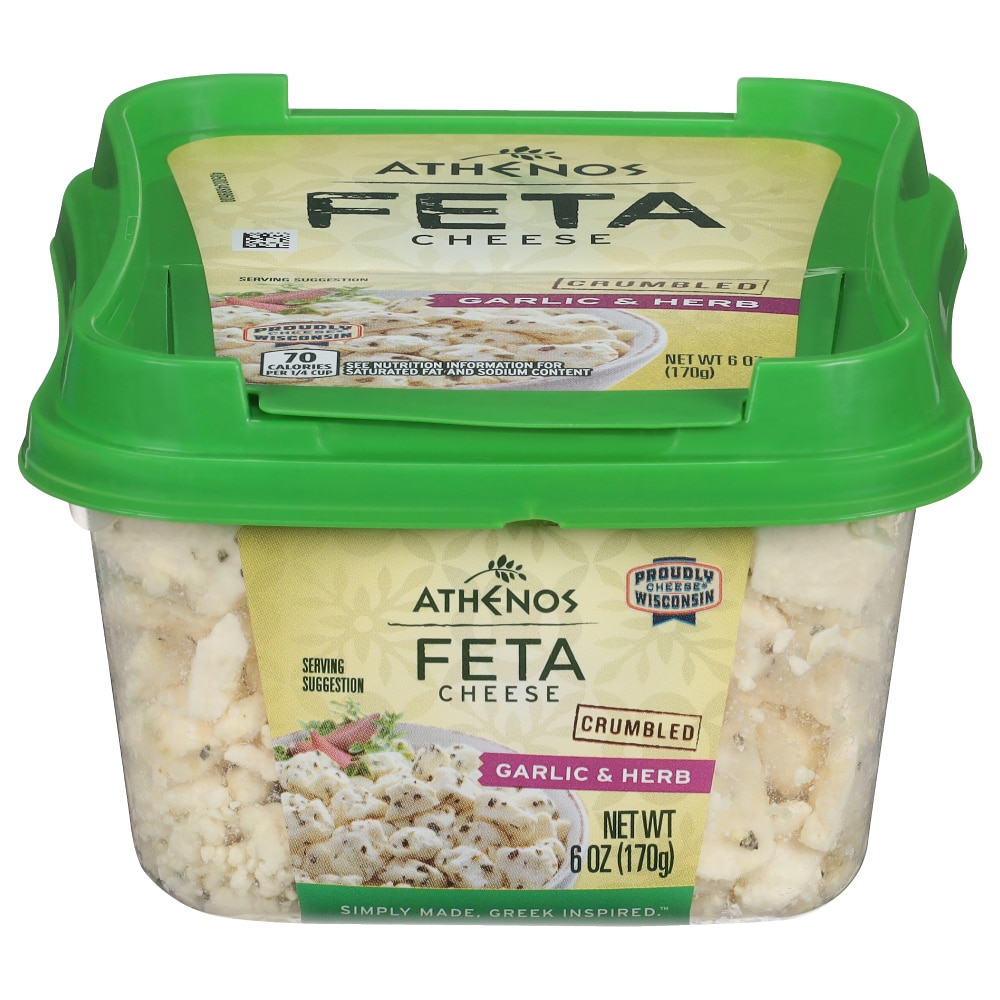 From our H-E-B Deli, this Mediterranean Herb crumbled feta has a pungent saltiness thatâs balanced by the added deliciousness of oregano, basil, garlic and dried tomatoes. Made with milk from cows not treated with rBST,* this type of cheese is a tasty addition to salads, soups and gyros. Sprinkle some into your next pasta salad, stuffed peppers or even meatloaf mixture.