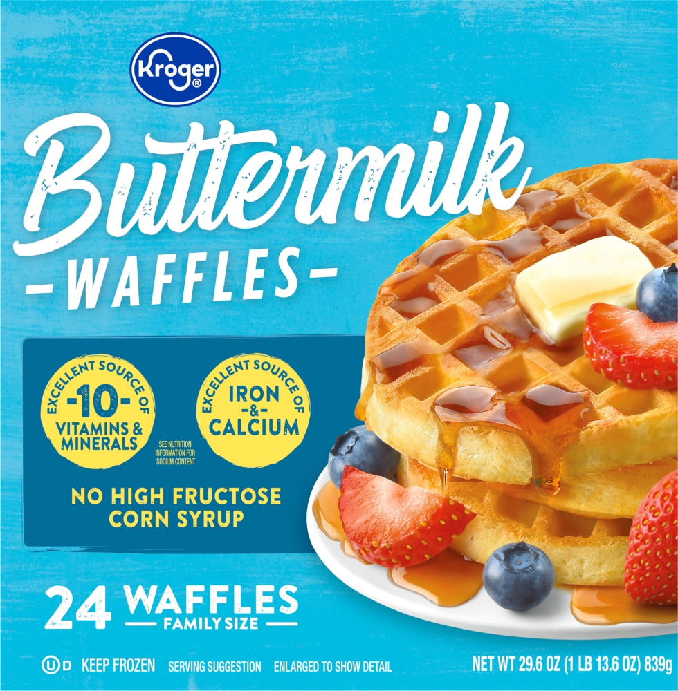 Speed up your breakfast routine by serving up some H-E-B buttermilk waffles. Easy to heat up from frozen in the toaster or oven, they provide 10 vitamins and minerals and have no artificial flavors. Delicious drizzled with syrup or honey, they give you a satisfying start that takes you all the way to lunchtime. Kosher.