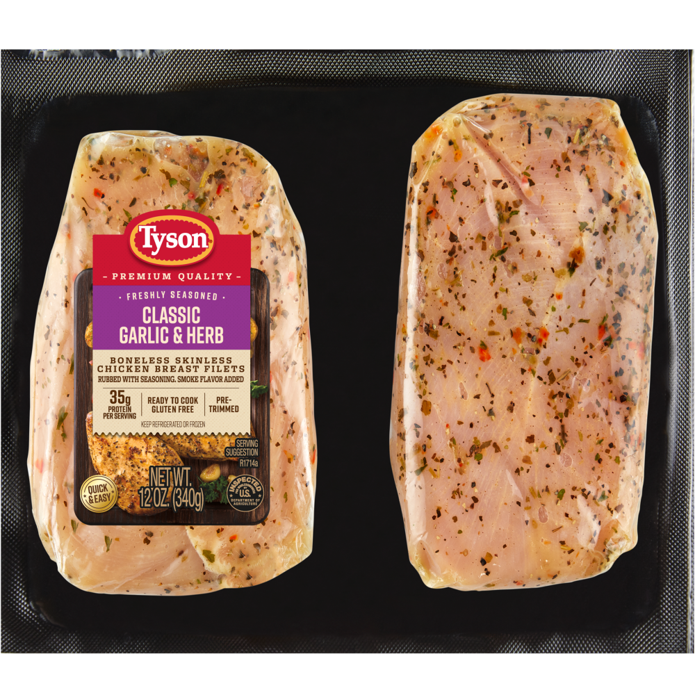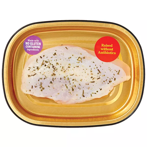 • Boneless skinless chicken breasts with rib meat • Seasoned with garlic and herbs • Thinly sliced • Ready to grill, pan-fry or bake • 100% natural: Minimally processed and no artificial ingredients • Prepped poultry option
