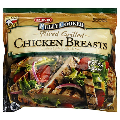 Flame-grilled and extra lean, this Texas-Size Pack of sliced H-E-B fully cooked chicken breast offers an effortless way to make your favorite poultry recipes. Seasoned with garlic and assorted spices, these chicken strips are sizzling-fast to heat up in a skillet. And since theyâre already fully cooked, itâs a convenient dinner option to have in your freezer to use whenever you want. Other ways to prep: microwave, oven and air fryer. Gluten-free.