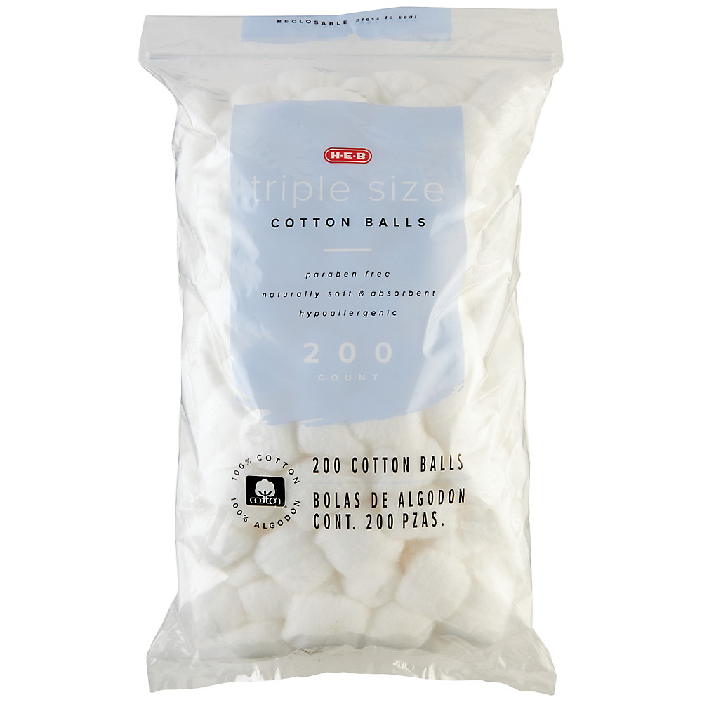 Experience the ultimate in softness and versatility with H-E-B Super Jumbo Cotton Balls. This 70-count pack of cotton balls is made from 100% cotton, ensuring they are soft, absorbent, and hypoallergenic. Free from parabens, these cotton balls are perfect for all your beauty and household needs. The reclosable bag keeps them fresh and ready for use, whether you're removing makeup, applying toner, or tackling small cleaning tasks around the house.