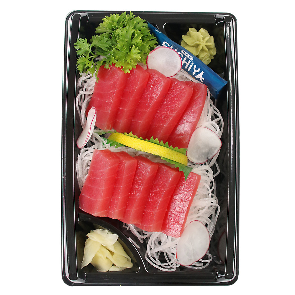 Freshly made in store and starring sliced raw tuna and salmon, this sashimi by H-E-B Sushiya is elegantly presented on a bed of crisp lettuce leaves. Even better, the tuna and salmon are 100% sustainably sourced. Give it a try today for lunch or as an appetizer. Includes wasabi, ginger and soy sauce.