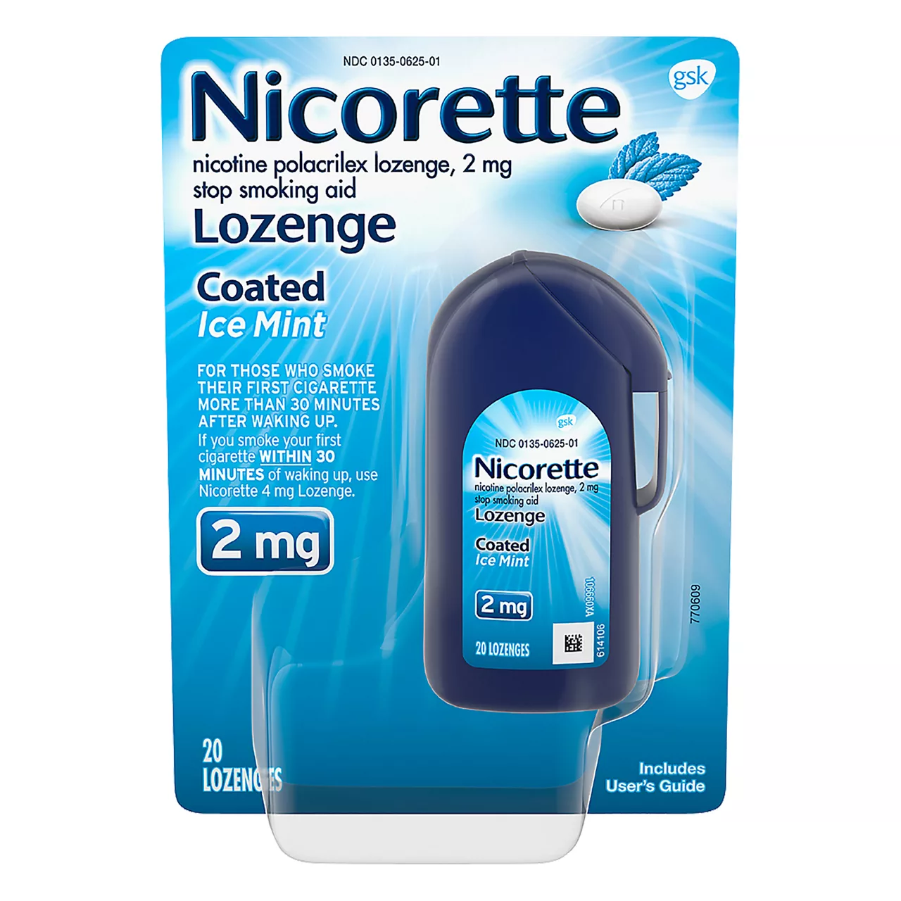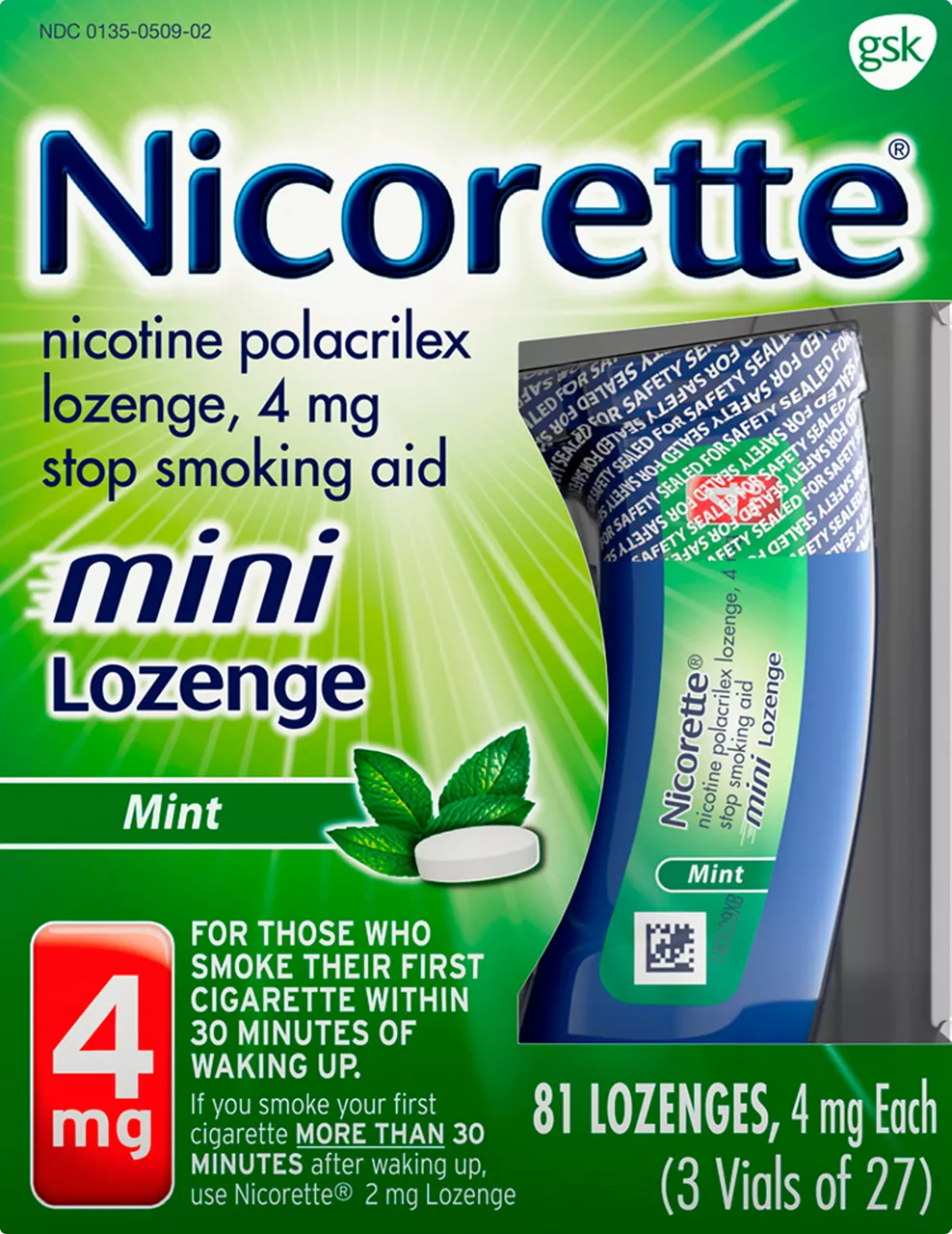 Active Ingredients: In Each Lozenge: Nicotine Polacrilex (4 mg) (Nicotine). Purpose: Stop Smoking Aid. Inactive Ingredients: Aspartame, Magnesium Stearate, Mannitol, Natural Peppermint Flavor, Potassium Bicarbonate, Sodium Alginate, Sodium Carbonate, Xanthan Gum.