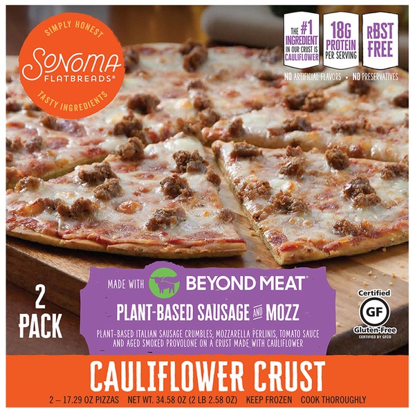Crust (Flour [Wheat Flour, Malted Barley Flour], Cauliflower, Pea Protein, Yeast, Canola Oil, Sugar, Salt), Sauce (Water, Tomato Paste, Sugar, Salt, Garlic Powder, Basil, Oregano, Xanthan Gum, Black Pepper), Cooked Chicken Sausage Crumbles (Skinless Chicken Meat, Natural Flavors, Salt), Reduced Fat Mozzarella Cheese (Pasteurized Part-Skim Milk, Nonfat Milk, Cheese Cultures, Modified Corn Starch (Ingredients Not in Regular Mozzarella Cheese), Salt, Vitamin A Palmitate, and Enzymes [(Ingredients Not in Regular Mozzarella Cheese]), Red Onion, Red Bell Peppers, Green Bell Peppers.