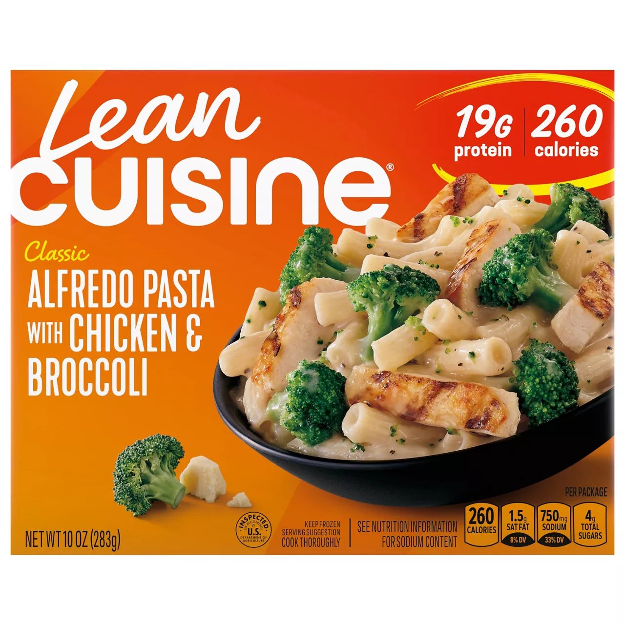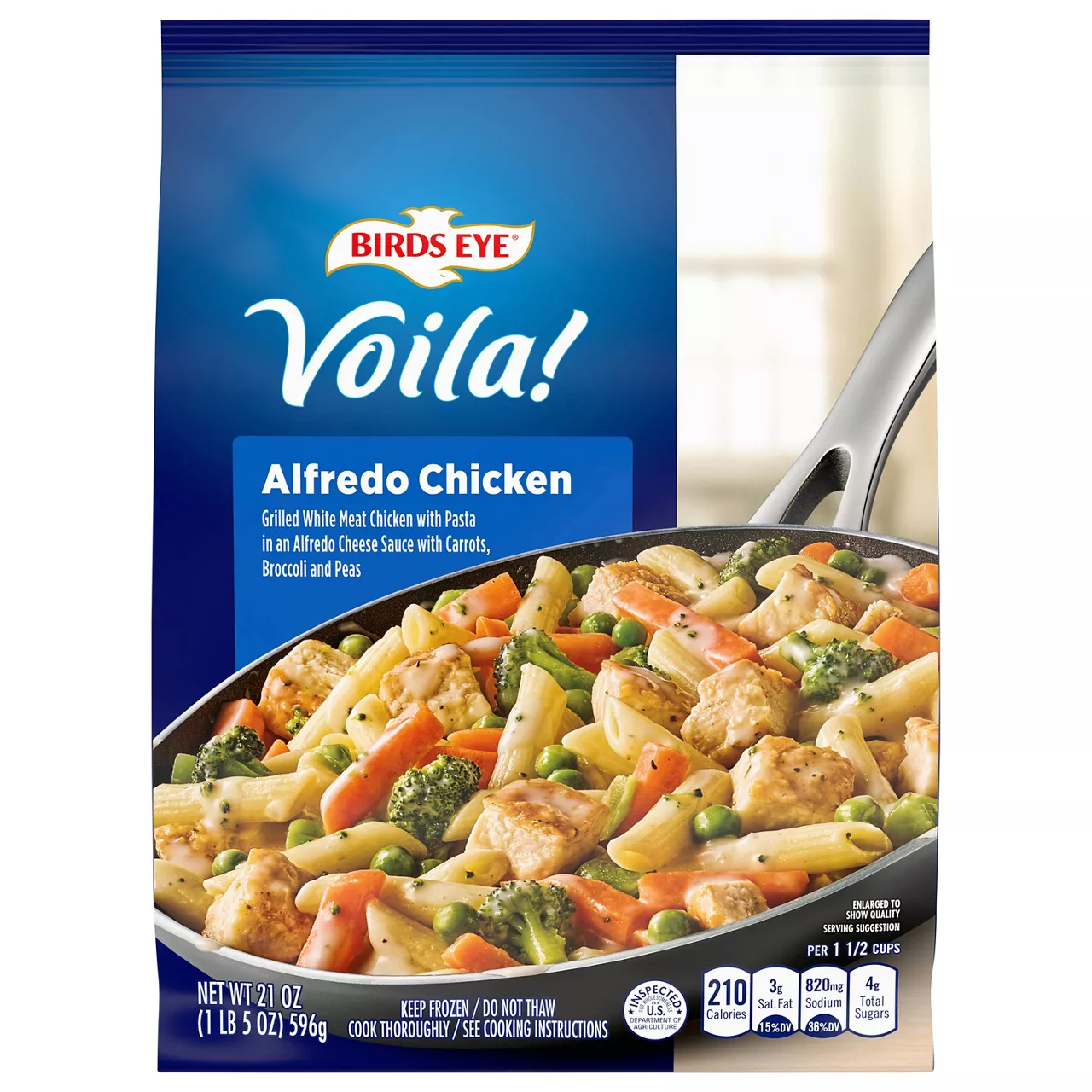 BROCCOLI. SEASONED COOKED CHICKEN (CHICKEN BREAST, WATER, SUGAR, SEA SALT, OLIVE OIL, ISOLATED SOY PROTEIN, SOY FIBER, RICE STARCH, NATURAL FLAVORING). ALFREDO SAUCE (WATER, PARMESAN CHEESE [PASTEURIZED MILK, CHEESE CULTURE, SALT, ENZYMES], ROMANO CHEESE FROM COW'S MILK [PART SKIM MILK, CHEESE CULTURE, SALT, ENZYMES], CORN STARCH, CREAM, CONTAINS 2% OR LESS OF: WHEY PROTEIN CONCENTRATE, POTASSIUM CHLORIDE, SEA SALT, NATURAL FLAVORINGS, BUTTER [CREAM, SALT], LOCUST BEAN GUM).