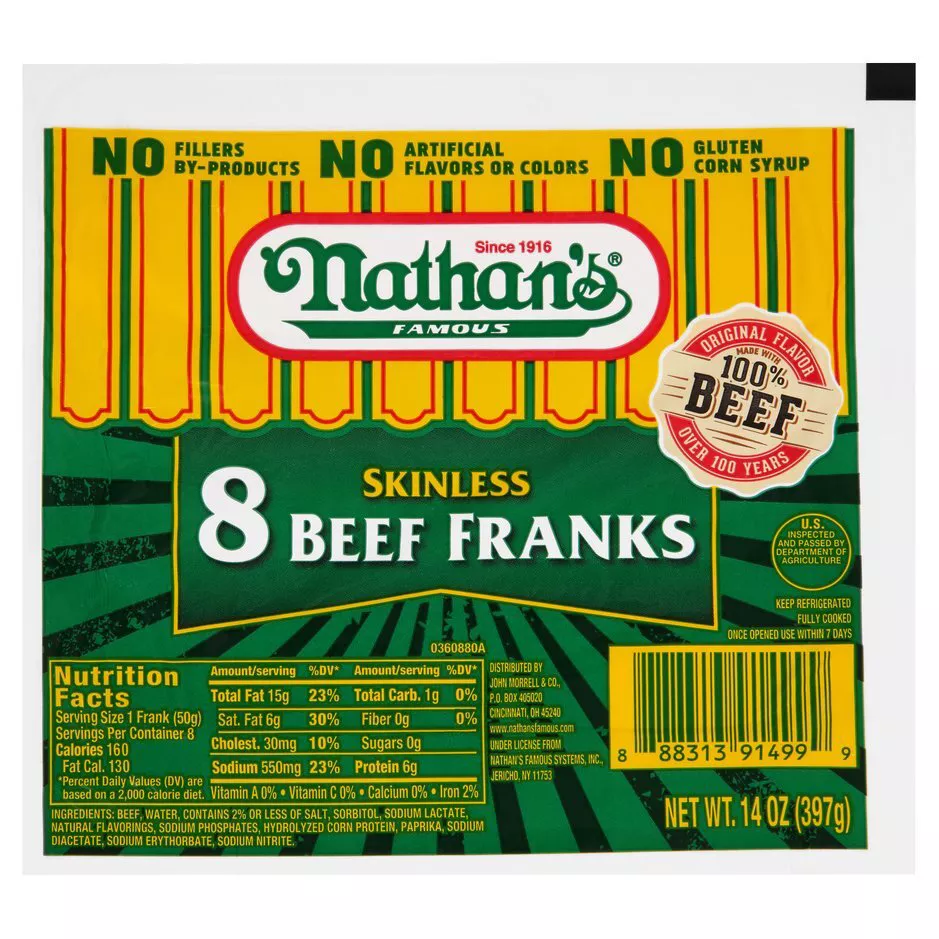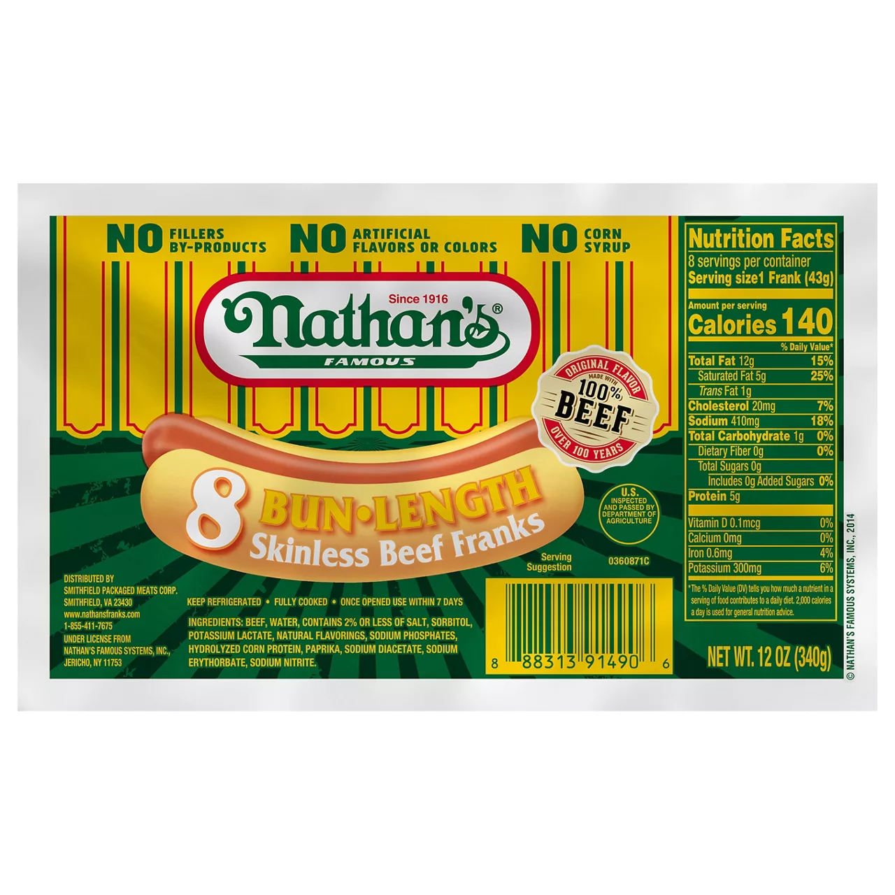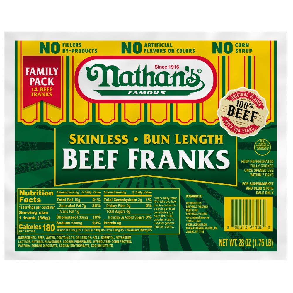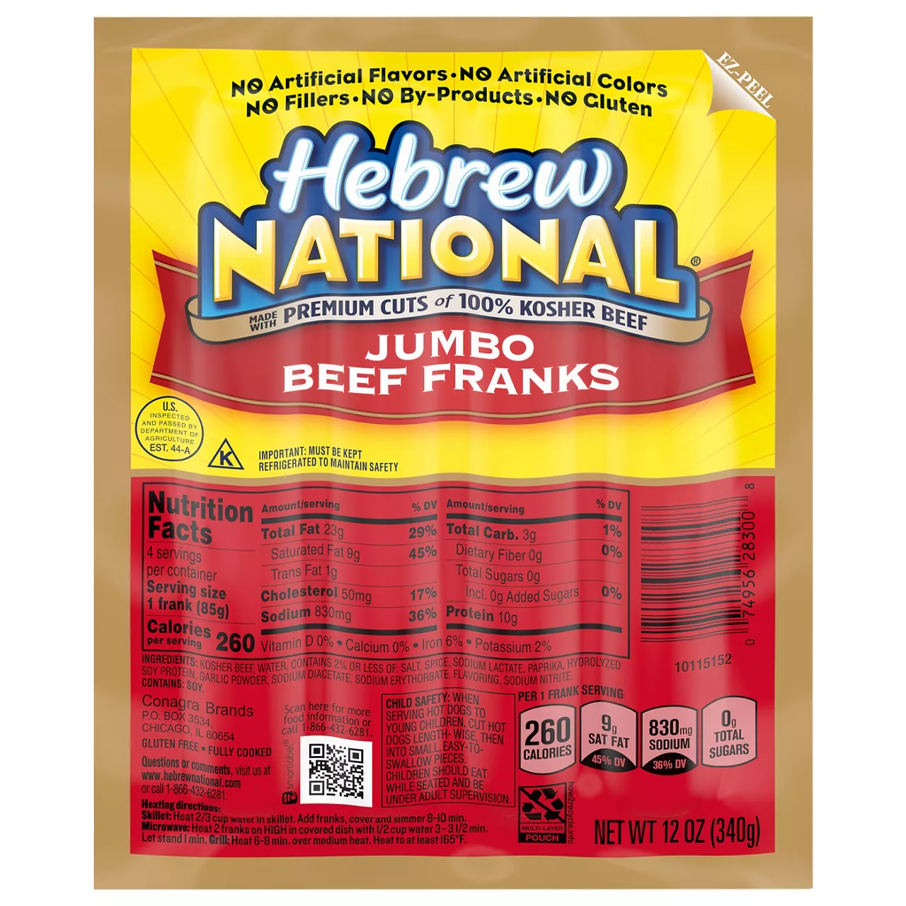 Hebrew National Beef Franks start with premium cuts of 100% kosher beef with a special blend of spices for thick, juicy beef hot dogs that are bursting with delicious flavor. Serve Hebrew National hot dogs at barbecues, family cookouts or as part of a quick lunch or dinner. Just put a delicious beef hot dog in a bun and add your favorite toppings. Hebrew National hot dogs are gluten free and made with no artificial flavors, artificial colors, fillers or by-products. These keto friendly beef franks...