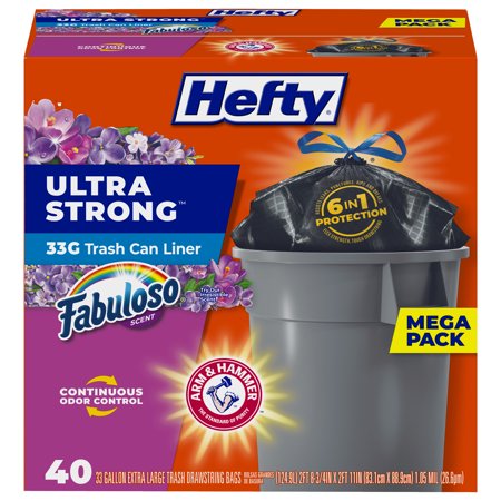 Large Trash Bags—This package contains 40 Hefty Ultra Strong black, 33 gallon, scented drawstring trash bags Arm & Hammer** Continuous Odor Control & Fabuloso Scent—Patented odor control, paired for the first time with the joyful scent of Fabuloso, leverages the power of Arm & Hammer to fight nasty odors and keep your kitchen smelling fresh 6 In 1 Protection—These flexible trash bags offer a powerful combination of six features that keep garbage where it belongs: flex strength, tough drawstring, patented odor control, resistance to leaks, puncture protection, and rip defense Dependable Drawstring Closure—The durable drawstring on these plastic garbage bags makes it easy to transport heavy loads, donations, seasonal items & more 100% Satisfaction Guarantee—We want you to be happy with your purchase! If you have any issues with our plastic trash bags, contact us via the hotline number on the back of the package so we can help
