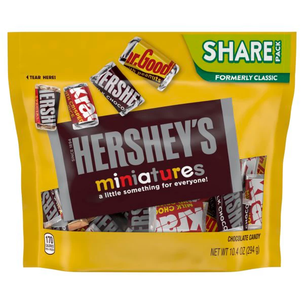 MILK CHOCOLATE (SUGAR, MILK, CHOCOLATE, COCOA BUTTER, MILK FAT, LECITHIN (SOY), PGPR, NATURAL FLAVOR).|CORN SYRUP, SUGAR, COCONUT, VEGETABLE OIL (PALM OIL, SHEA OIL, SUNFLOWER OIL, PALM KERNEL OIL, &/OR SAFFLOWER OIL), ALMONDS, CHOCOLATE, SKIM MILK, CONTAINS 2% OR LESS OF: LACTOSE (MILK), COCOA, WHEY (MILK), SALT, LECITHIN (SOY), MILK FAT, PGPR, COCOA BUTTER, HYDROLYZED MILK PROTEIN, SODIUM METABISULFITE (TO MAINTAIN FRESHNESS), VANILLIN (ARTIFICIAL FLAVOR).|SUGAR, WHEAT FLOUR, COCOA BUTTER, CHOCOLATE, LACTOSE (MILK), VEGETABLE OIL (PALM OIL, PALM KERNEL OIL), SKIM MILK, MILK FAT, CONTAINS 2% OR LESS OF: LECITHIN (SOY), PGPR, VANILLIN (ARTIFICIAL FLAVOR), SALT, YEAST, BAKING SODA.|MILK CHOCOLATE (SUGAR, COCOA BUTTER, CHOCOLATE, SKIM MILK, MILK FAT, LACTOSE, LECITHIN (SOY), PGPR), PEANUTS, SUGAR, DEXTROSE, SALT, TBHQ & CITRIC ACID (TO MAINTAIN FRESHNESS).|SUGAR, CORN SYRUP, CHOCOLATE, COCOA, INVERT SUGAR, MILK FAT, EGG WHITES, COCOA BUTTER, LECITHIN (SOY), OIL OF PEPPERMINT, PGPR, NATURAL FLAVOR.