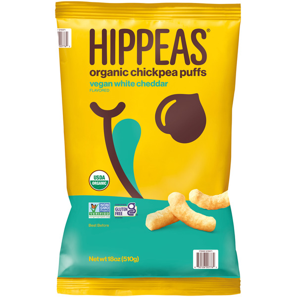 Vegan nacho "cheesy" puffs Made with sustainably-grown chickpeas Packed with plant-based protein and fiber 130 calories, 4 grams of protein, and 3 grams of fiber per serving Non-GMO Project Verified, Certified Gluten-Free, Vegan, and Kosher (Only good vibes here, man!) Made with no peanuts, tree nuts, soy, artificial flavors, colors, or preservatives Also available in other flavors Try our other HIPPEAS Chickpea Snacks