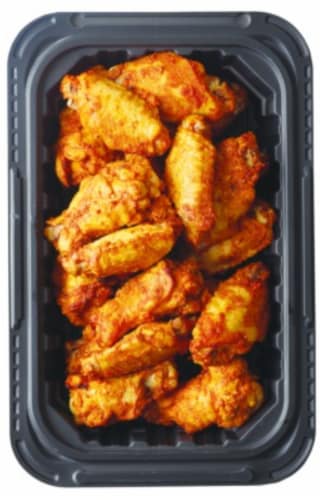 CHICKEN WINGS FIRST AND SECOND SECTIONS, WATER, VINEGAR, SODIUM PHOSPHATES, GARLIC POWDER. COATED WITH: SEASONING [SPICES, MALTODEXTRIN, MODIFIED CORN STARCH, SALT, SUGAR, YEAST EXTRACT, NATURAL FLAVORS, HOT SAUCE (AGED CAYENNE PEPPERS, VINEGAR,SALT, GARLIC POWDER), VINEGAR, CITRIC ACID, EXTRACTIVES OF PAPRIKA, XANTHAN GUM, NOT MORE THAN 2% SILICON DIOXIDE ADDED TO PREVENT CAKING], BREADER [WHEAT FLOUR, MODIFIED CORN STARCH, MODIFIED WHEAT STARCH, SALT, SOYBEAN OIL (AS A PROCESSING AID). GLAZED WITH: WATER, SEASONONG [SPICES, MALTODEXTRIN, MODIFIED CORN STARCH, SALT, SUGAR, YEAST EXTRACT, NATURAL FLAVORS, HOT SAUCE (AGED CAYENNE PEPPERS, VINEGAR, SALT, GARLIC POWDER), VINEGAR, CITRIC ACID, EXTRACTIVES OF PAPRIKA, XANTHAN GUM, NOT MORE THAN 2% SILICON DIOXIDE ADDED TO PREVENT CAKING], BREADER [WHEAT FLOUR, MODIFIED CORN STARCH, MODIFIED WHEAT STARCH, SALT, SOYBEAN OIL (AS PROCESSING AID). GLAZED WITH: WATER, SEASONING [SPICES, MALTODEXTRIN, MODIFIFED CORN STARCH, SALT, SUGAR, YEAST EXTRACT, NATURAL FLAVORS, HOT SAUCE (AGED CAYENNE PEPPERS, VINEGAR, SALT, GARLIC POWDER), VINEGAR, CITRIC ACID, EXTRACTIVES OF PAPRIKA, XANTHAN GUM, NOT MORE THAN 2% SILICON DIOXIDE ADDED TO PREVENT CAKING]. COATING SET IN VEGETABLE OIL.