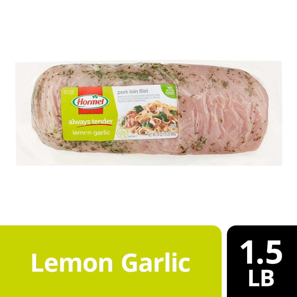 Hormel Always Tender Lemon Garlic Pork Loin Filet. A pork loin filet marinated in a lemon garlic seasoning perfect as a component in a recipe or to eat on its own.