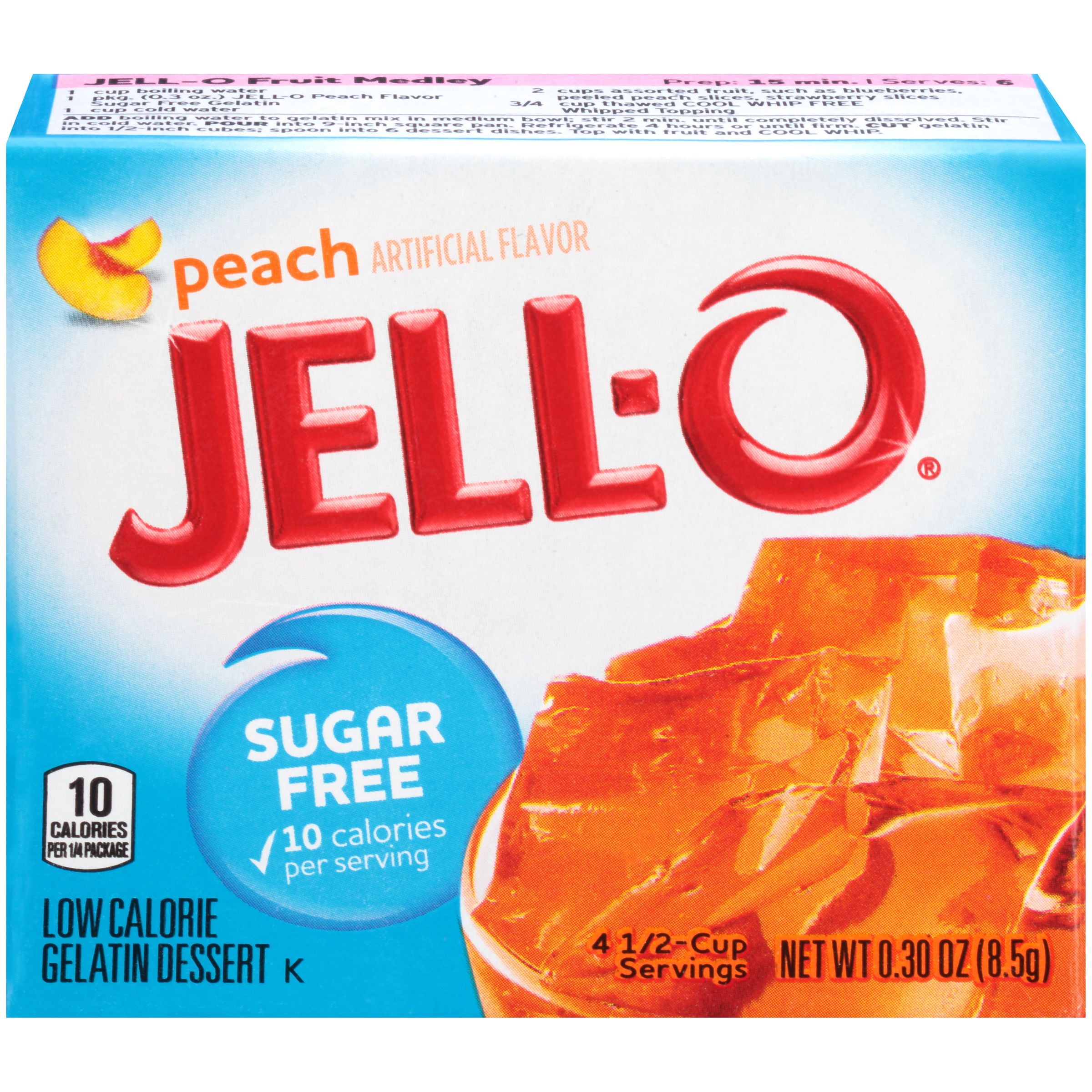 Jell-O Peach Instant Gelatin Mix is an easy to make peach flavored dessert. Perfect for cooling off on a hot day, this mouthwatering treat delivers the classic refreshingly sweet black cherry taste you know and love. With no artificial sweeteners and no high fructose corn syrup and fat free, this dessert is one you can feel good about sharing with your family. This 3 ounce package makes four 1/2-cup servings so you can prepare enough for the whole family. It's easy to make a tasty dessert for kids...