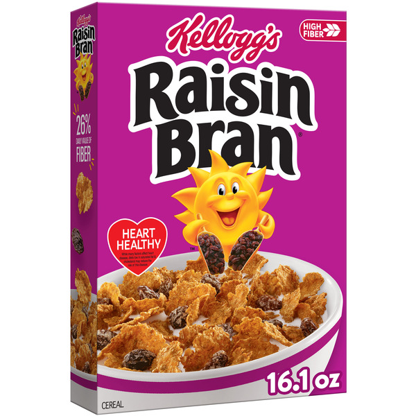 Kellogg's Raisin Bran, Breakfast Cereal, Original, 18.7 Oz Crunchy, pleasantly sweet breakfast cereal that's bursting with delicious raisins in every irresistible spoonful Start your day with crispy, toasted bran flakes balanced with the satisfying goodness of sweet raisins Low fat; With 28 grams of whole grain; An excellent source of fiber and a good source of 8 vitamins and minerals per serving; No artificial colors or flavors; No high fructose corn syrup; Contains wheat ingredients; Kosher pareve A heart-healthy cereal that's sure to please the whole family (while many factors affect heart disease, diets low in saturated fat and cholesterol may reduce the risk of heart disease) Includes 1, 18.7-ounce box of convenient, ready-to-eat cereal; Packaged for freshness and great taste