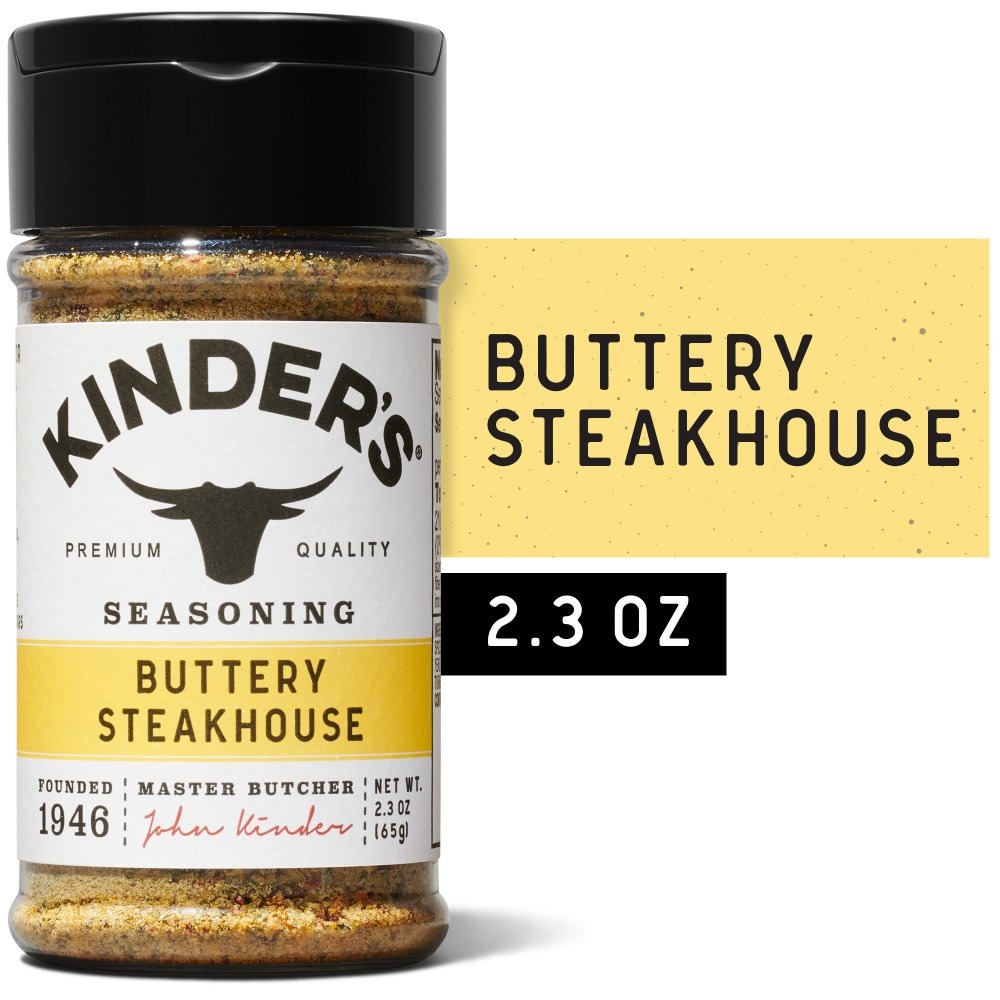 About Kinderâs Buttery Steakhouse Seasoning With our Buttery Steakhouse Rub, the name says it all. We have blended real dairy butter with the herbs and cracked pepper of great steakhouse seasonings. Butter makes steaks better...but don't be fooled. Buttery Steakhouse is excellent on all proteins and veggies and even scrambled eggs. Kinder's: Handcrafted by People Obsessed with Flavor In 1946, World War II Navy veteran John Kinder started his own butcher shop in a small storefront in San Pablo,...