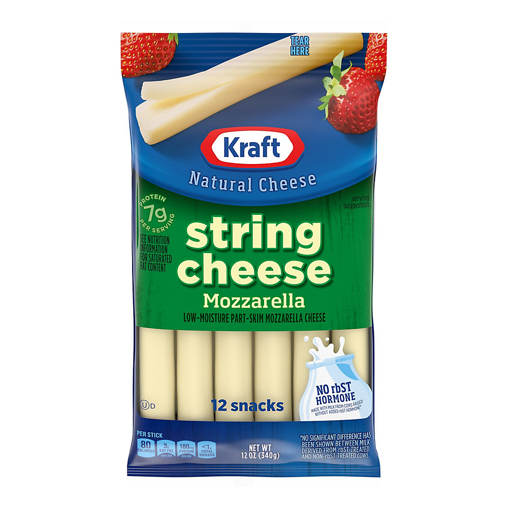 Kraft Mozzarella String Cheese Sticks are a convenient snack to satisfy the cheese lovers in your family. Perfectly portioned, these low-moisture part-skim mozzarella sticks are an easy way to add protein and calcium to your family's diet, see nutrition information for saturated fat content. Kraft mozzarella cheese is crafted from fresh pasteurized milk for quality and flavor, and each string cheese stick has 7 grams of protein. Keep a bag of Kraft string cheese in the fridge for an easy after-school...