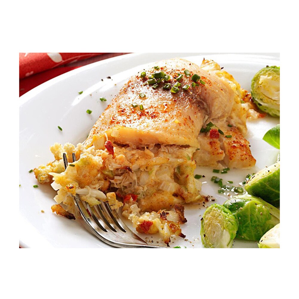 Tilapia, Crabmeat Stuffing [Imitation Crabmeat (Fish Protein (Pollock, Whiting and/or Arrowtooth Flounder), Water, Wheat Starch, Sugar, Egg Whites, Corn Starch, Sorbitol, contains 2% or less of: Salt, Modified Food Starch, Natural and Artificial Flavors, Soybean Oil, Sodium Tripolyphosphate, Tetrasodium Pyrophosphate, Paprika Oleoresin, Carmine, Corn Syrup, Soy Lecithin, Color Added), Imitation Liquid Butter [Liquid and Hydrogenated Soybean Oil, Contains Less Than 2% of Salt, Soy Lecithin, Natural & Artificial Flavor, Beta Carotene (Color), TBHQ and Citric Acid Added to Protect Flavor, Dimethylpolysiloxane, and Anti-Foaming Agent Added), Breadcrumbs (Enriched Flour (Wheat Flour, Malted Barley Flour, Niacin, Reduced Iron, Thiamin Mononitrate (Vitamin B1), Riboflavin (Vitamin B2), Folic Acid), Water, High Fructose Corn Syrup, Yeast, Salt, Vegetable Oil (Soybean, Cottonseed, and/or Canola), Sugar, may contain 2% or less of the following: Wheat Gluten, Dextrose, Soy Flour, Whey, Calcium Propionate (Preservative), Sodium Stearoyl Lactylate (Dough Conditioner), Mono and Diglycerides, Soy Lecithin, Molasses, Honey, Whole Wheat Flour, Corn Flour, Cornmeal, Citric Acid, Grain Vinegar, Wheat Starch, Corn Starch, Potato Flour, Rice Flour, Wheat Bran, Oat Fiber, Calcium Sulfate, Datem, Potassium Iodate, Guar Gum, Calcium Phosphate, Enrichment (Vitamin E, Acetate, Vitamin A Palmitate, Vitamin D3), Lactic Acid, Ascorbic Acid (Dough Conditioner), Spices & Coloring, Natural and Artificial Flavor, Sesame Seeds, Dehydrated Parsley, Dehydrated Garlic, Spices, Parmesan and/or Romano Cheese (Pasteurized Cowâs Milk and/or Sheepâs Milk, Cheese Cultures, Salt, Enzymes), Italian Cheese Blend (Parmesan Cheese (Pasteurized Part-Skim Milk, Cheese Cultures, Salt, Enzymes), Romano Cheese (Pasteurized Sheepâs Milk, Cheese Cultures, Salt, Enzymes), Asiago Cheese (Pasteurized Cowâs Milk, Cheese Cultures, Salt, Enzymes), Powdered Cellulose (to prevent caking)), Parmesan Cheese (Pasteurized Part-Skim Milk, Cheese Cultures, Salt, Enzymes, Powdered Cellulose (to prevent caking)), Water, Green Onion, Potassium Sorbate (Preservative)].