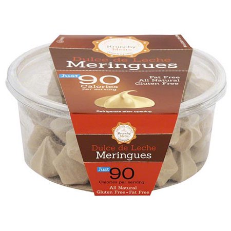 Meringues, Vanilla, Gluten Free, Fat Free, Carton 1 OZ Carefully crafted meringues. Just 100 calories. Fat free. All natural. Gluten free. krunchymelts.com. Contains eggs. 1 oz (28 g) Hallandale, FL 33009 855-WE-MERINGUE