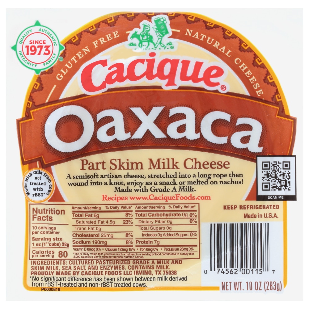 La Vaquita Oaxaca is an authentic, delicious, semi-soft melting cheese, rich in flavor and tradition, and popular for preparing quesadillas. At La Vaquita, our unique formula uses whole milk. Slightly salty, with a savory, mellow, buttery flavor, Oaxaca is sometimes referred to as the "mozzarella of Mexico." This cheese is named after the state of Oaxaca in southern Mexico. The cheese curds are stretched, formed into long ropes, and then gently wound into balls. This item is an individually wrapped,...