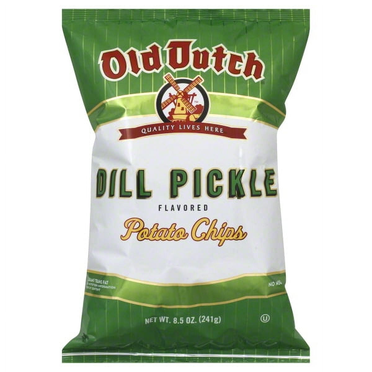 Delicious dill pickle flavor potato chips Tangy, tart and crispy No artificial flavors or preservatives Party size bag Is perfect for sharing