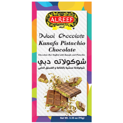 Milk Chocolate [Sugar, Cocoa Butter, Milk, Chocolate, Lactose, Skim Milk, Soy Lecithin (Emulsifier), Barley Malt Powder, Artificial Flavor], Pistachio Paste, Kadayif (Wheat Flour, Water, Corn Starch, Salt, Sunflower Oil), Milkfat, Sugar Coated Pistachios (Pistachios, Sugar), Cocoa Butter, Milk, Salted Almonds (Almonds, Salt), Skim Milk, Salt, Soy Lecithin (Emulsifier), Artificial Flavors, Hazelnuts.