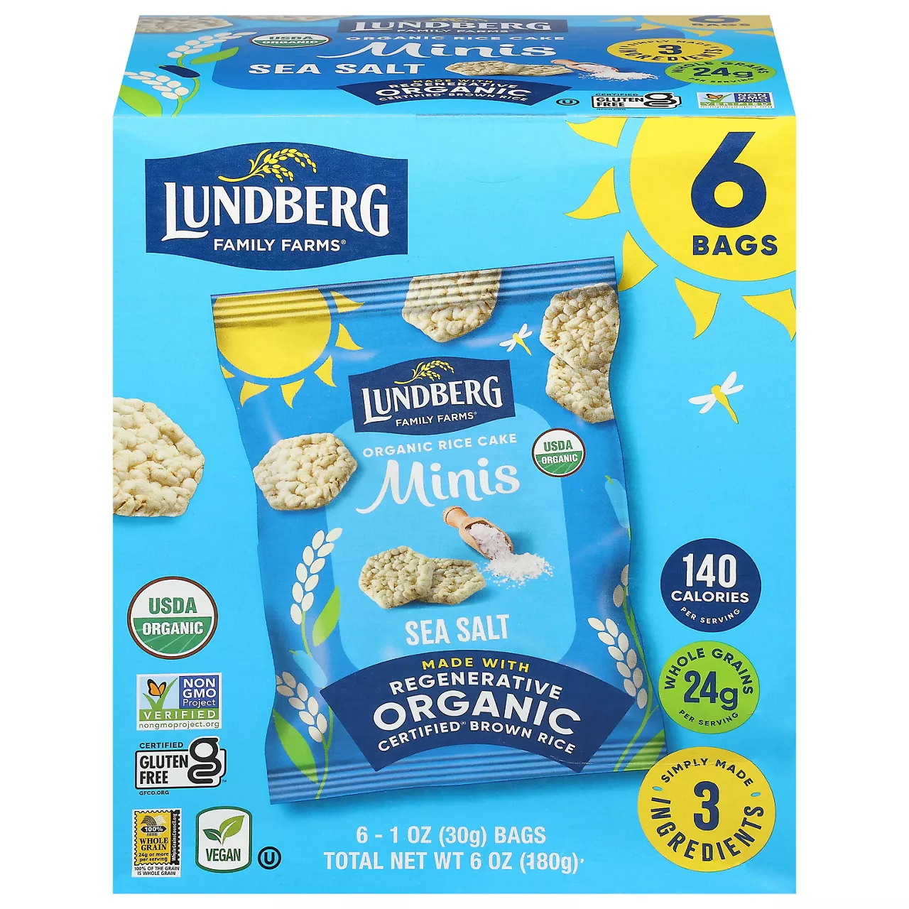 Contains 1- 8.5 Ounce Bag of Lundberg Organic Sea Salt Rice Cake Minis. Made with fresh milled organic brown rice and grown sustainably on our farms in California, we carefully craft each Rice Cake Mini to be thin, lightly crunchy, and full of flavor. These thinner, smaller rice cakes are crispy and delicious, made with only whole grain organic brown rice and sea salt. Enjoy them straight out of the bag or dress them up with your favorite toppings or dips. Our Rice Cake Minis are USDA Certified Organic, Non-GMO Project verified, Certified Gluten-Free, and Vegan. Since 1937, the Lundberg family has been dedicated to crafting the best-tasting, finest-quality rice products. Each package holds a promise of our continued dedication to great taste, conservation, sustainability, and innovation