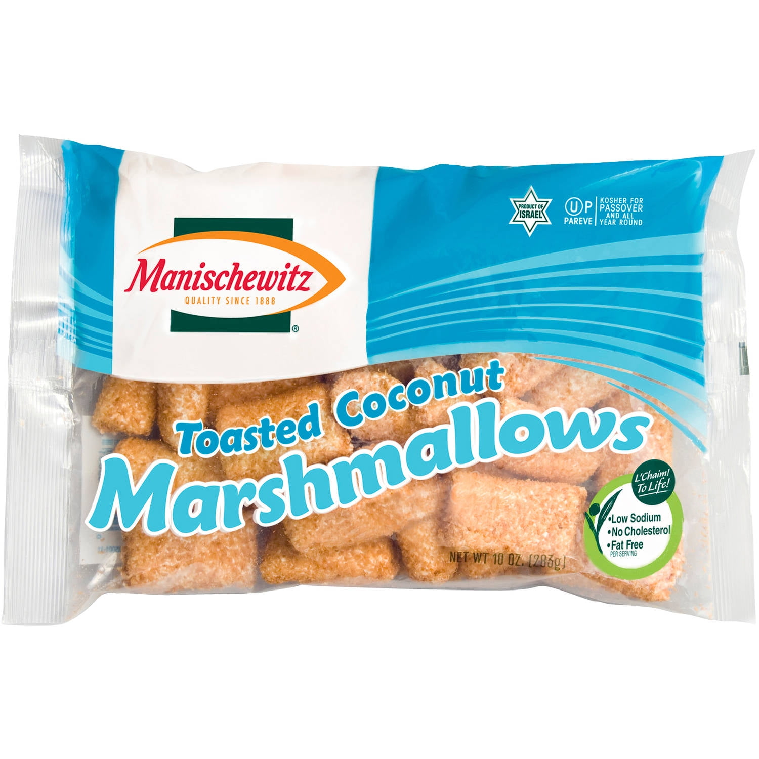 Marshmallows, Toasted Coconut Passover. Quality since 1888. Manischewitz Marshmallows - for a fun treat! Manischewitz Marshmallows make a delicious snack anytime. You will love the light, sweet fluffy taste that's so much fun to eat. For the holidays, Manischewitz Marshmallows can help you decorate a dessert or include them in your favorite recipe. So for a fun treat, enjoy Manischewitz Marshmallows. Kosher-Pareve. Made in Israel.