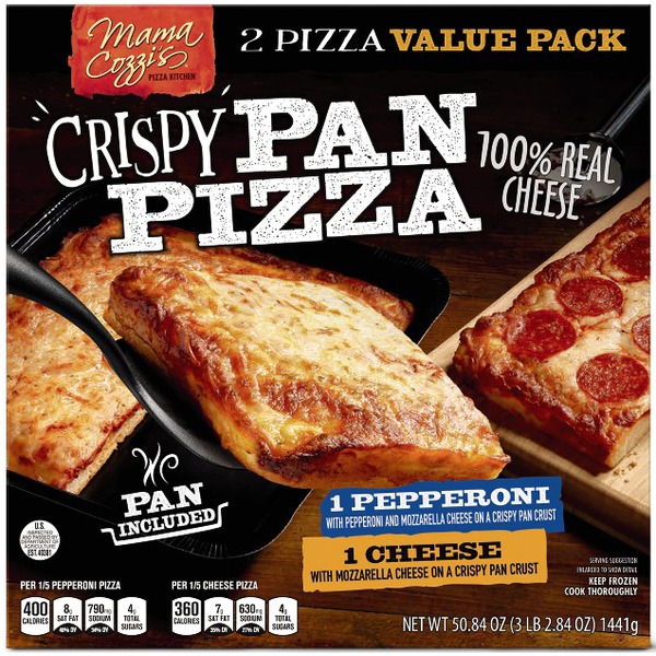 Milited Edition Marketside Crispy Crust Pepperoni Pan Pizza, Medium, 26.17 oz. Bakes in a pan inluded with the pizza. Zesty pepperoni and shredded low-moisture mozzarella. Keep refrigerated. Cook before eating. Previously frozen for your protection. Bakes in 14-17 minutes at 425 degrees.