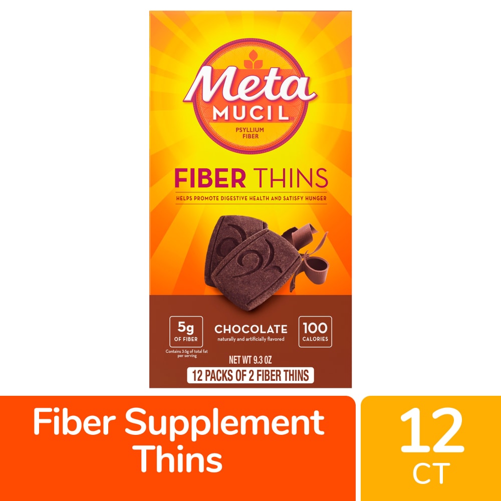 GREAT-TASTING SOURCE OF FIBER. Contains 5 grams of fiber per servings, and just 100 calories (4g total fat per serving) SUPPORT YOUR DIGESTIVE HEALTH. Metamucil Fiber Thins help support your digestive health and helps satisfy hunger* TRUSTED BY PROFESSIONALS. Metamucil is the #1 doctor recommended fiber brand TAKE YOUR FIBER ANYWHERE. Individually wrapped servings for on-the-go use PICK YOUR FAVORITE. Also available in Cinnamon Spice & Apple Crisp