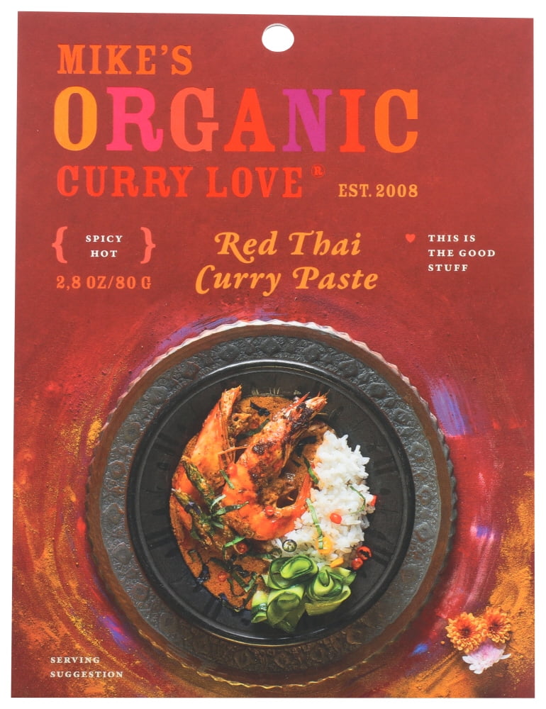 MIKE'S ORGANIC CURRY LOVE RED THAI CURRY PASTE CONTAINS A DELICIOUS MIX OF LEMONGRASS, GALANGAL, KAFFIR LIME LEAF AND OTHER SPICES TO CREATE A SAUCE BASE WITH AUTHENTIC THAI FLAVORS. BLEND THIS 2.8 OZ. POUCH OF SPICY HOT PASTE WITH A CAN OF COCONUT MILK, AND ADD YOUR FAVORITE PROTEIN OR VEGETABLES FOR A FLAVORFUL MEAL.