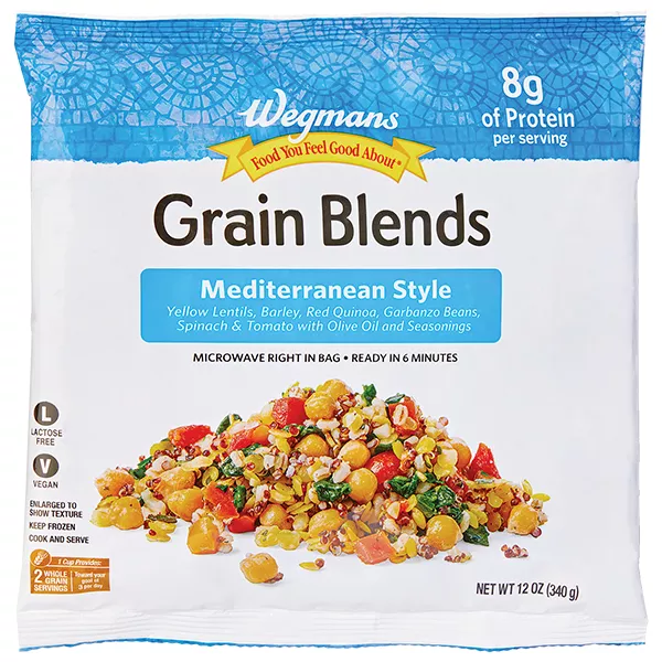 Hydrated couscous (durum wheat semolina, water), bulgur wheat, grilled zucchini, yellow carrot, cooked red quinoa (water, white vinegar, salt), red pepper, grilled onion, extra virgin olive oil, sweetened raisins (raisins, canola oil), dehydrated tomato, parsley, basil, salt, concentrated vegetable juice (carrot, leek), yellow lemon peel, garlic extract, cinnamon, thickening agents (xanthan gum, guar gum, glucose), thyme, ginger extract. Contains: Wheat.