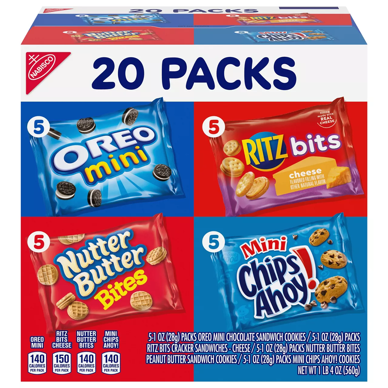 Oreo Mini - Unbleached Enriched Flour (Wheat Flour, Niacin, Reduced Iron, Thiamine Mononitrate {Vitamin B1}, Riboflavin {Vitamin B2}, Folic Acid), Sugar, Palm and/or Canola Oil, Dextrose, Cocoa (processed with Alkali), High Fructose Corn Syrup, Leavening (Baking Soda and/or Calcium Phosphate), Salt, Soy Lecithin, Chocolate, Artificial Flavor **Mini Chips Ahoy! - Unbleached Enriched Flour (Wheat Flour, Niacin, Reduced Iron, Thiamine Mononitrate {Vitamin B1}, Riboflavin {Vitamin B2}, Folic Acid), Sugar, Canola Oil, Palm and Palm Kernel Oil, Cocoa (processed with Alkali), High Fructose Corn Syrup, Salt, Dextrose, Baking Soda, Milk, Soy Lecithin, Natural and Artificial Flavor, Caramel Color **Mini Ritz - Unbleached Enriched Flour (Wheat Flour, Niacin, Reduced Iron, Thiamine Mononitrate {Vitamin B1}, Riboflavin {Vitamin B2}, Folic Acid), Canola Oil, Sugar, Palm Oil, Leavening (Calcium Phosphate, Baking Soda), Salt, Soy Lecithin