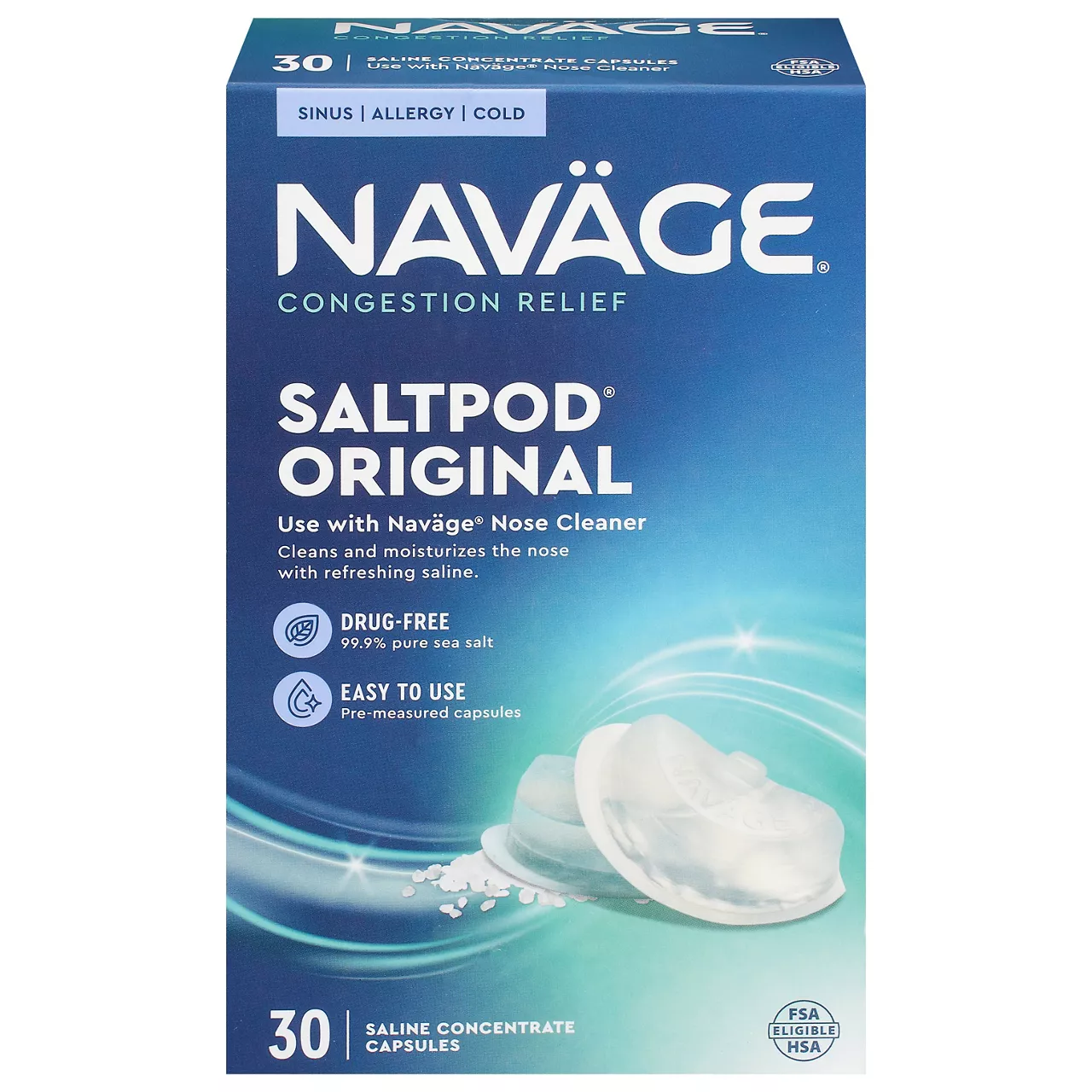 " Navage SaltPod Original 30-Pack Nasal irrigation works! Nasal irrigation is clinically proven to relieve sinus congestion naturally, without drugs. Whether it's congestion due to allergies, sinusitis, the common cold, dry air, pollen, or pollution, nasal irrigation is safe and effective. Even better, if you irrigate regularly, you will rely less on prescription drugs and decongestants like pseudo-ephedrine, make fewer doctor visits, breathe better through your nose, snore less, sleep deeper, and...