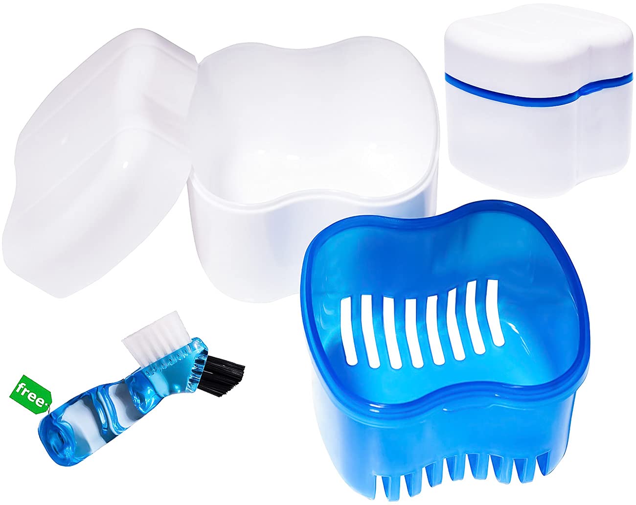 Denture Brush Retainer Case, Denture Case,Denture Cups Bath,Dentures Container with Basket Denture Holder for Travel,Mouth Guard Night Gum Retainer Container (Blue)