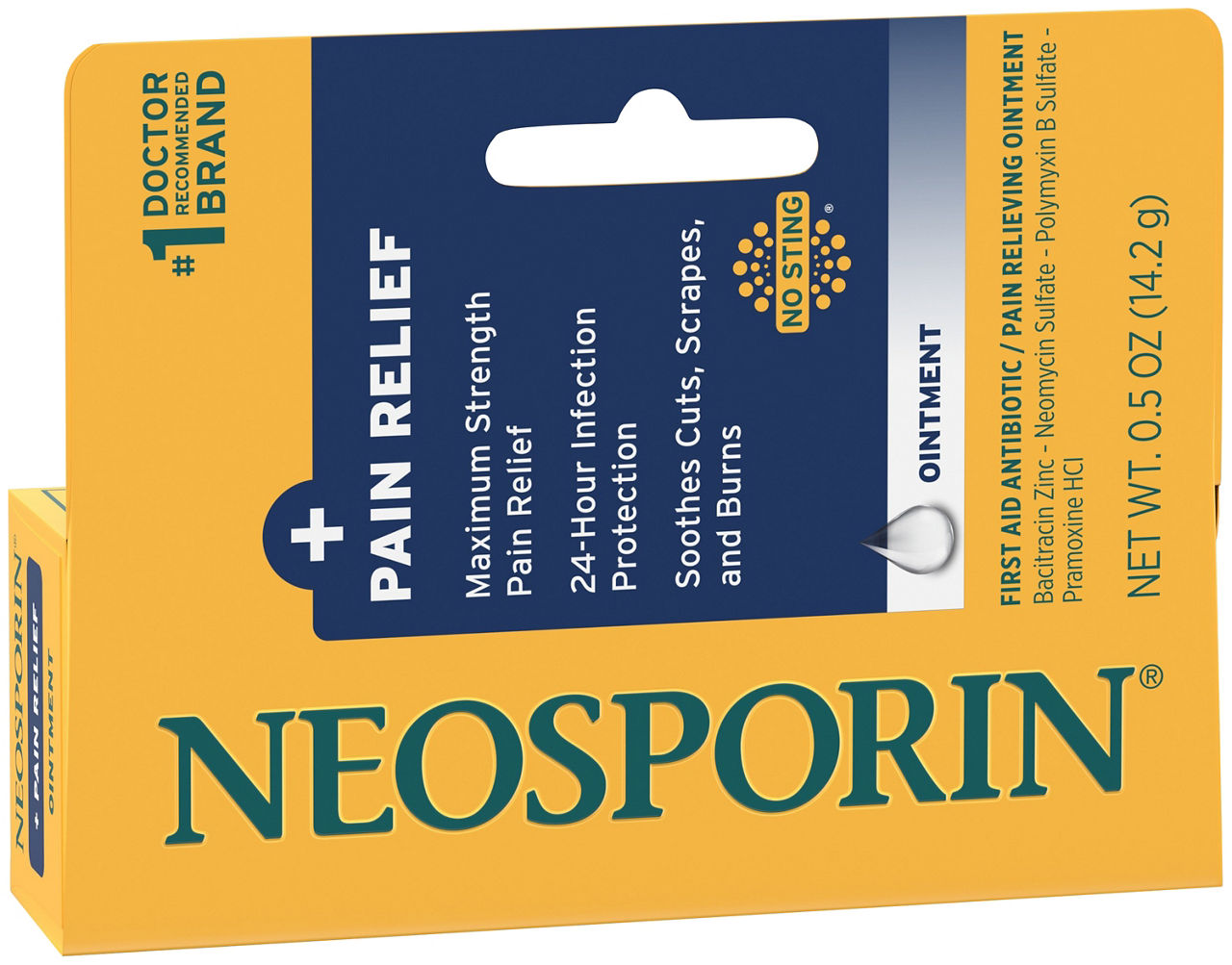 Tube of Neosporin + Pain Relief Dual Action Antibiotic Cream for first aid wound careTopical antibiotic cream provides infection protection of minor cuts, scrapes, burns, & woundsThis first aid cream also helps to soothe & reduce pain with maximum-strength relief with no stingContains the antibiotics neomycin & polymyxin B to help prevent wound infectionAlso formulated with pramoxine hydrochloride as an external analgesic for pain reliefThis dual-action cream not only helps fight infection for 24 hours, but also soothes & reduces painFirst aid topical antibiotic & pain relief cream from the #1 doctor recommended brandFor best results, clean the affected area, apply the antibiotic cream, then cover with a bandage Topical antibiotic cream provides infection protection of minor cuts, scrapes, burns, & wounds This first aid cream also helps to soothe & reduce pain with maximum-strength relief with no sting Contains the antibiotics neomycin & polymyxin B to help prevent wound infection Also formulated with pramoxine hydrochloride as an external analgesic for pain relief This dual-action cream not only helps fight infection for 24 hours, but also soothes & reduces pain First aid topical antibiotic & pain relief cream from the #1 doctor recommended brand For best results, clean the affected area, apply the antibiotic cream, then cover with a bandage