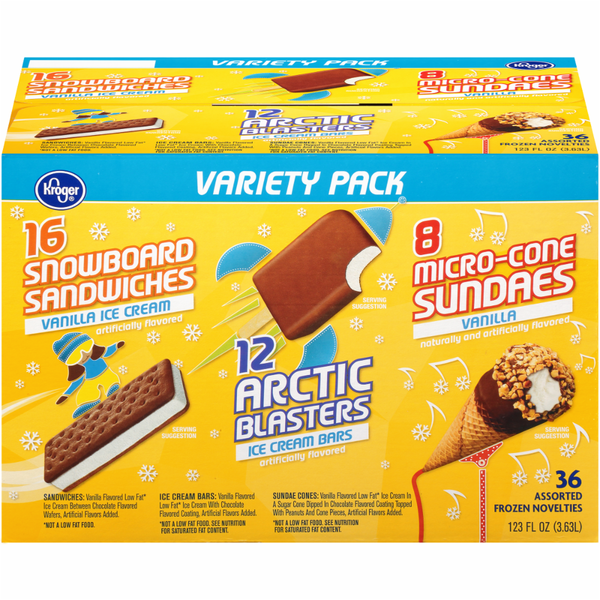 VANILLA SANDWICH: DAIRY PRODUCT SOLIDS, SKIM MILK, SUGAR, BLEACHED WHEAT FLOUR, CORN SYRUP, CREAM, COCONUT OIL, CARAMEL COLOR, MALTODEXTRIN, DEXTROSE, PALM OIL, CORN FLOUR, COCOA, NATURAL FLAVOR, BAKING SODA, MODIFIED CORNSTARCH, SALT, PROPYLENE GLYCOL MONOSTEARATE, MONO AND DIGLYCERIDES, SOY LECITHIN, CELLULOSE GEL, GUAR GUM, MONOGLYCERIDES, CAROB BEAN GUM, CELLULOSE GUM, ANNATTO COLOR. VANILLA WITH CHOCOLATEY SWIRLS CONE: DAIRY PRODUCT SOLIDS, SKIM MILK, SUGAR, CORN SYRUP, CREAM, COCONUT OIL, BLEACHED WHEAT FLOUR, PEANUTS, MALTODEXTRIN, PALM OIL, COCOA, PALM OLEIN, REDUCED MINERALS WHEY, PROPYLENE GLYCOL MONOSTEARATE, SOYBEAN OIL, SOY LECITHIN, SALT, CELLULOSE GEL, GUAR GUM, MONOGLYCERIDES, CAROB BEAN GUM, NATURAL FLAVOR, CELLULOSE GUM, MILK, CHOCOLATE, ANNATTO COLOR. CHOCOLATE WITH CHOCOLATEY SWIRLS CONE: DAIRY PRODUCT SOLIDS, SKIM MILK, SUGAR, CORN SYRUP, CREAM, COCONUT OIL, BLEACHED WHEAT FLOUR, COCOA PROCESSED WITH ALKALI, PEANUTS, MALTODEXTRIN, PALM OIL, COCOA, PALM OLEIN, REDUCED MINERALS WHEY, PROPYLENE GLYCOL MONOSTEARATE, SOYBEAN OIL, SOY LECITHIN, SALT, CELLULOSE GEL, GUAR GUM, MONOGLYCERIDES, CAROB BEAN GUM, NATURAL FLAVOR, CELLULOSE GUM, MILK, CHOCOLATE. COOKIE DIPPED BAR: DAIRY PRODUCT SOLIDS, SKIM MILK, SUGAR, COCONUT OIL, CORN SYRUP, PALM OIL, CREAM, COCOA, MALTODEXTRIN, REDUCED MINERALS WHEY, WHEAT FLOUR, PROPYLENE GLYCOL MONOSTEARATE, COCOA PROCESSED WITH ALKALI, CELLULOSE GEL, GUAR GUM, CHOCOLATE, MONOGLYCERIDES, MILK CAROB BEAN GUM, CARAMEL COLOR, SALT, CORNSTARCH, SOY LECITHIN, BAKING SODA, AMMONIUM BICARBONATE, CELLULOSE GUM, NATURAL FLAVOR.