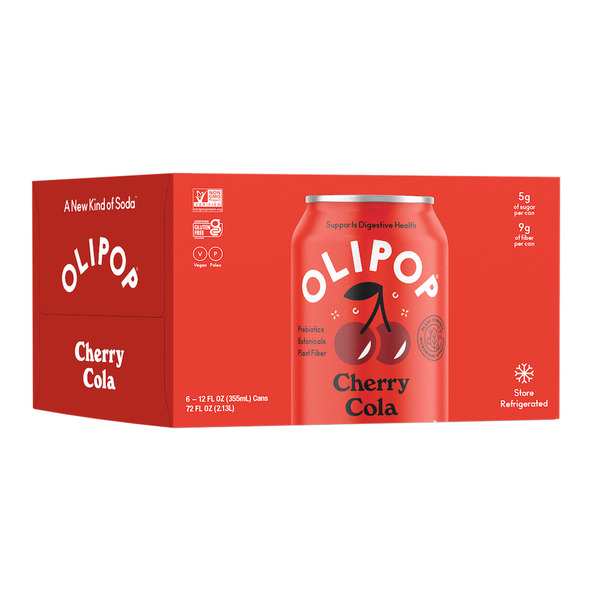 1 Can of Olipop Cherry Cola. Prebiotic soda back by science and made with natural ingredients, prebiotics, plant fiber, and botanicals to support digestive health. 9 grams of dietary fiber and only 5 grams of natural sugars per can. Vegan, Gluten-free, Paleo-Friendly, Keto-Friendly, Non-GMO Project Verified. No artificial sweeteners, colors, flavors, preservatives, or ingredients
