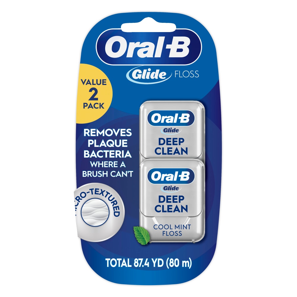 Oral-B Glide Pro-Health Deep Clean Waxed Dental Floss, Cool Mint, 40m, 2 Pack, helps remove plaque between teeth and below the gum line with a cool burst of clean feeling. The silky-smooth, shred resistant floss slides up to 50% more easily in tight spaces vs. regular floss. This waxed dental floss contains a coating of natural wax for improved grip while flossing. More dentists and hygienists recommend Oral-B dental floss than any other brand. Using floss daily helps keep your teeth and gums healthy...