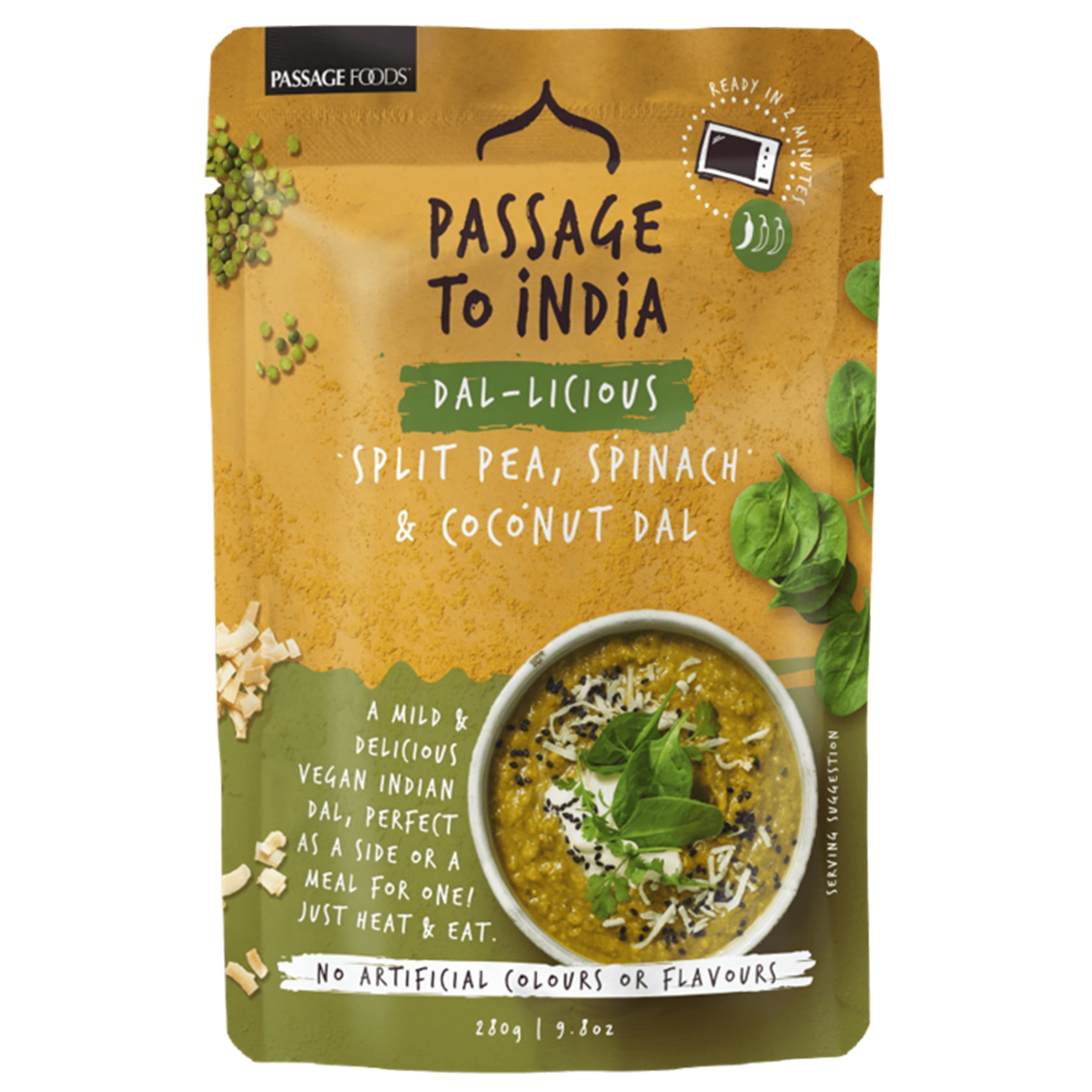 Elevate your dining with the Passage Foods Passage to Asia Heat-and-Eat Split Pea, Spinach, and Coconut Dal – an embodiment of Indian flavors and modern convenience that enriches your culinary journey. Mild Vegan Delight: Elevate your dining experience with Passage Foods Passage to Asia Heat-and-Eat Split Pea, Spinach, and Coconut Dal – a mild and flavorful vegan dal that caters to your culinary preferences. Ready in Two Minutes: Experience the joy of an authentic Indian dal without the wait – just heat and savor in a mere two minutes. Complete Meal Flexibility: Enjoy the versatility of this dish, perfect as a side or a full-fledged meal for one, allowing you to savor authentic Indian flavors in your own way. Authentic Ingredients: Savor the essence of Indian cuisine with split pea, spinach, and coconut coming together to create a harmonious and delicious blend. No Artificial Compromises: Relish the genuine taste of Indian dal, free from any artificial colors or flavors, ensuring an authentic dining experience. Convenient Solution: Elevate your meals with ease, whether it's lunch, dinner, a side, or a snack – this heat-and-eat dal offers a quick and delightful solution. Made by Passage Foods: Trust in the quality and expertise of Passage Foods, bringing you an authentic Indian culinary delight crafted to perfection.