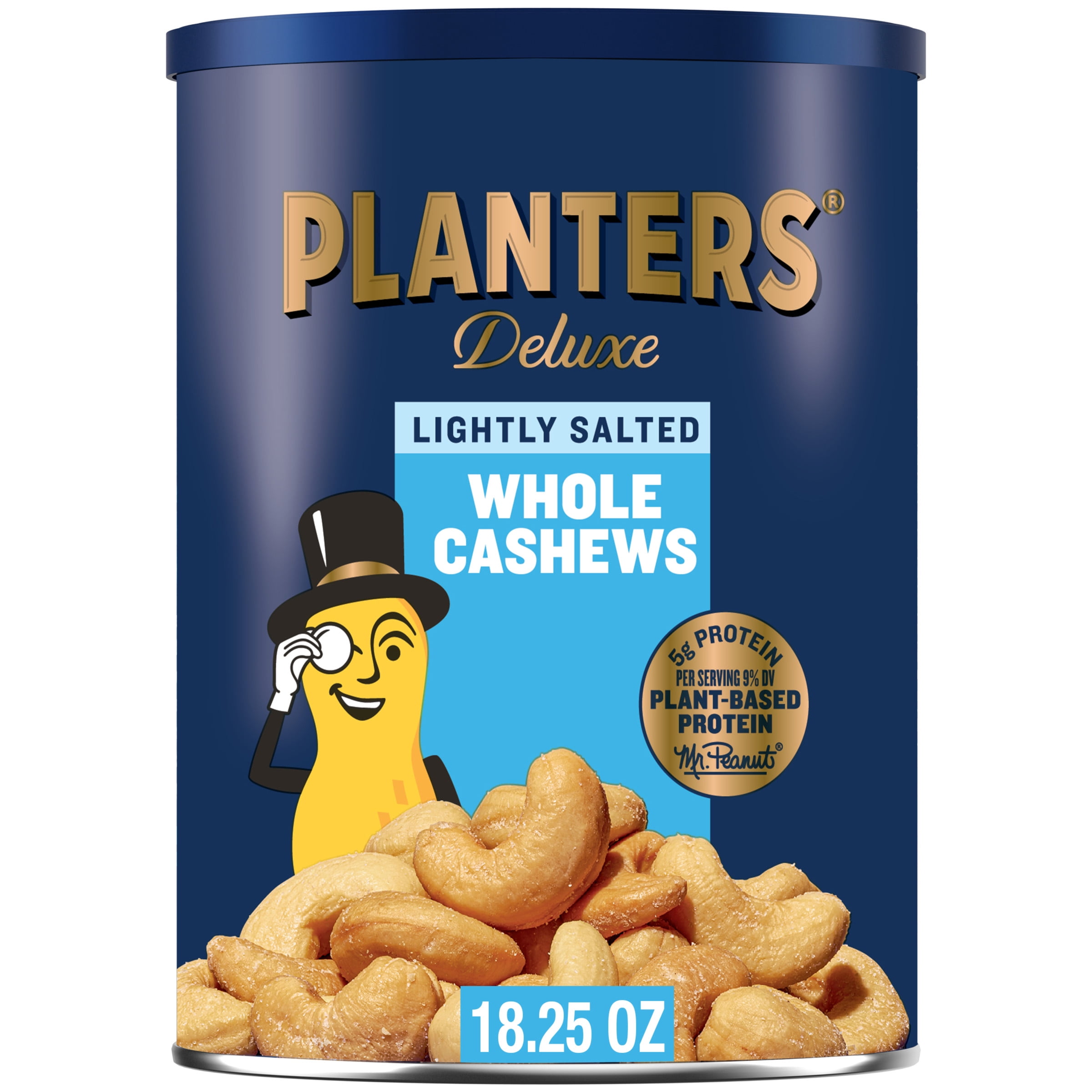 Snacking Made Whole: Go nuts for deluxe whole cashews that satisfy your snack cravings. These creamy, lightly salted cashews are delicious snack foods the whole family will love Lower Sodium: Skimp on sodium, but never on flavor. With 50% less sodium than PLANTERS Deluxe Salted Whole Cashews, these lightly salted cashews can still satisfy your salty snack cravings Snack Strong: Irresistibly crunchy PLANTERS Deluxe Lightly Salted Cashews contain 5g of plant-based protein and 170 calories per 1oz serving to help ward off hunger and keep you going between mealtimes Always Satisfying: For parties, cocktail hour, or midday breaks, deluxe lightly salted cashews are always a satisfying snack idea. The resealable airtight canister is handy for on-the-go snacking on road trips or in offices What You Get: Includes one, 18.25oz airtight, resealable container containing PLANTERS Deluxe Lightly Salted Whole Cashews for easy, sharable snacking; Packaged for freshness and great taste