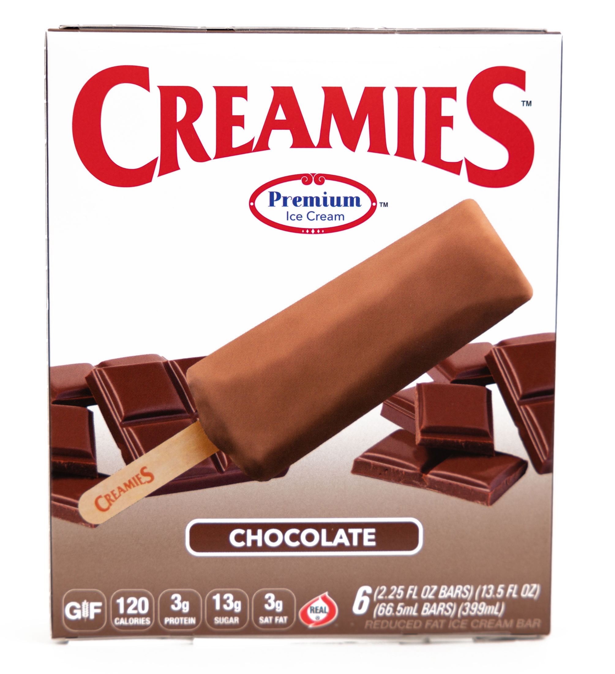 Ice Cream Bar, Reduced Fat, Chocolate Premium ice cream. The original. Gluten free. 33% less fat than regular ice cream. Real. You'll enjoy trying all the wonderful flavors of Creamies: Banana, Chocolate, Orange, Strawberry and Chocolate Dipped: Mint, Cherry and Banana. This ice cream bar contains 5 grams of fat per serving compared to regular ice cream bars, which contain 8 grams of fat per serving. Allergen Information: Contains milk. 6 - 2.25 fl oz (66.5 ml) bars [13.5 fl oz (399 ml)]
