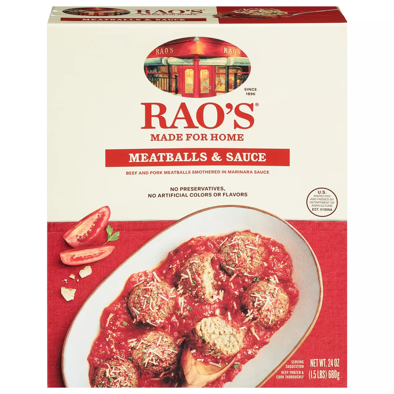 Ingredients: Beef Meatballs (Beef, Water, Bread Crumbs [Wheat Flour], Textured Soy Protein Concentrate [Soy Protein Concentrate, Caramel Color], Egg Whites, Soy Protein Concentrate, Contains 2% or less of each:Romano Cheese [Cow's and Sheep's Milk, Cheese Cultures, Salt, Enzymes], Onion, Natural Flavorings, Corn Syrup Solids, Salt), Seasoned Tomato Sauce (Ground Tomatoes in Puree [Diced Tomatoes, Tomato Juice, Tomato Puree {Tomato Paste, Water}, Salt, Citric Acid, Calcium Chloride, Ascorbic Acid], Sofrita [Red Onions, Olive Oil, Garlic, Red Pepper Flakes], Tomato Paste, Kosher Salt, Basil), Italian Blended Cheese (Pecorino Romano [Pasteurized Sheep's Milk, Salt, Animal Rennet], Parmigiano Reggiano P.D.O. Cheese [Raw Cow's Milk, Salt, Animal Rennet. Aged over 24 months]).