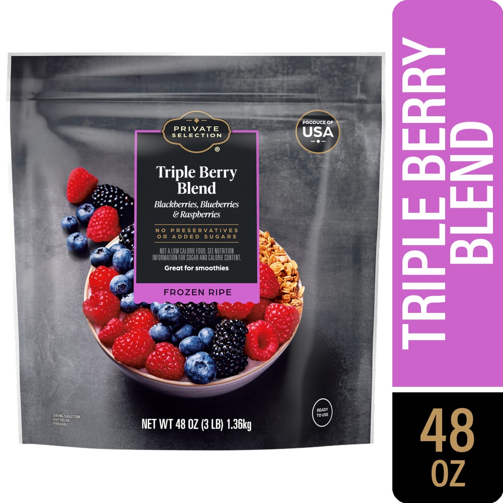 Private Selection® Triple Berry Blend is a mixture of sweet and tart berries that perfectly complement each other. Picked at their peak, they are frozen ripe to deliver fresh-tasting fruit to your table, ready to use in your favorite recipe, dessert or smoothie. The Private Selection journey rewards your sense of good taste.