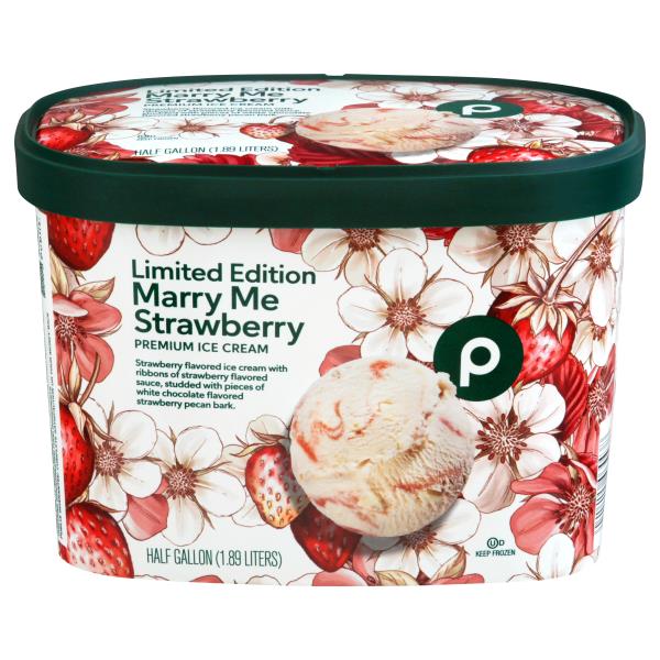 Limited Edition Strawberry flavored ice cream with ribbons of strawberry flavored sauce, studded with pieces of white chocolate flavored strawberry pecan bark. Contains bioengineered food ingredients. Publix Guarantee: Complete satisfaction or your money back. publix.com. Scan for more information.