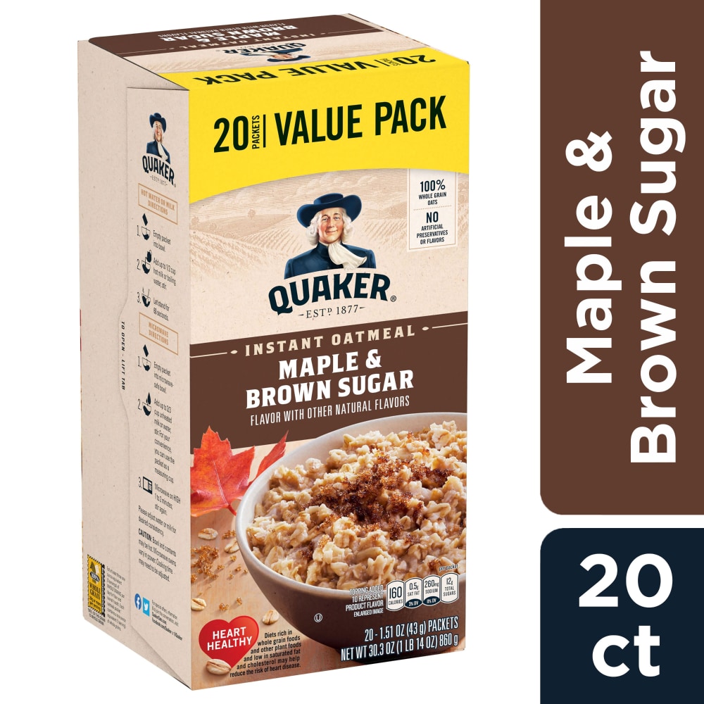 Quaker Instant Oatmeal Maple & Brown Sugar Flavor offers a warm and comforting breakfast experience in a convenient, single-serving packet. Each 1.51 oz packet is packed with the rich taste of maple syrup and sweet brown sugar, making it a delicious way to kickstart your morning. With 20 packets per box, you can easily prepare a satisfying bowl of oatmeal in just minutesâsimply add hot water or microwave. Made with whole grains, this oatmeal is not only tasty but also a source of essential nutrients,...