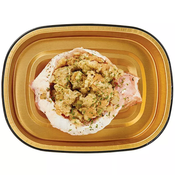 <strong>Ingredients: Boneless Pork Chop, Herb Stuffing</strong> (Chicken Broth [Water, Chicken Base {Chicken Broth, Salt, Chicken Fat, Dextrose, Potato Flour, Natural Flavor, Carrot Juice Concentrate, Onion Juice Concentrate}], Stuffing Crumbs [Wheat Flour, Natural Cane Sugar, Yeast, Caramel Color, Sea Salt, Canola Oil], Onions, Butter [Pasteurized Cream, Salt], Spices, Salt, Cultured Sugar, Maltodextrin, Natural Butter Flavor [Whey Powder, Salt, Natural Flavor], Pork, Granulated Garlic, Granulated Onion, Veal, Mustard Flour, Sugar)<strong>, Black Pepper, Parsley.</strong>