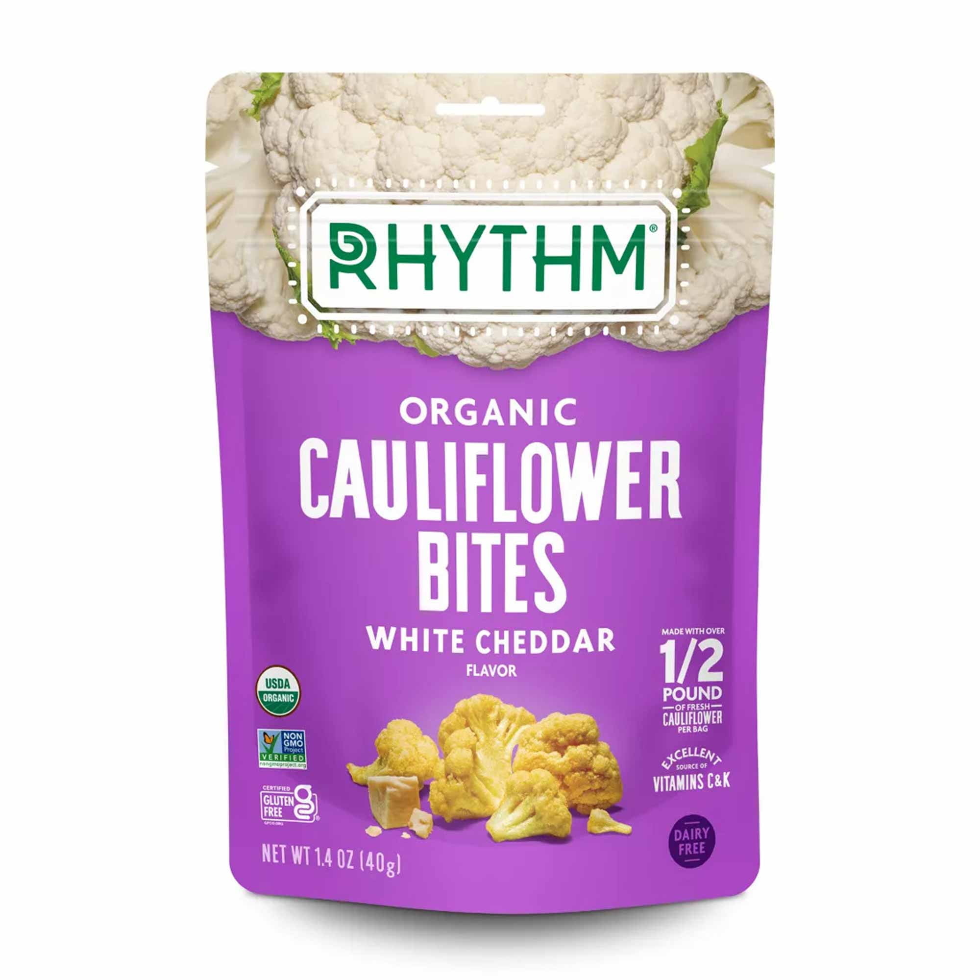 Cauliflower Bites, Organic, White Cheddar Flavor Contains 12 g of total fat per serving. USDA Organic. Certified Gluten-free. gfco.org. Dairy free. Certified Organic by: Organic Certifiers. Certified Vegan. vegan.org. Excellent source of vitamins C & K. Good source of fiber. Non-GMO Project verified. nongmoproject.org. Snacks full of life. Want to get a head of the bunch? You grabbed the right bag! Make your taste buds sing with creamy, cheesy flavor in every crunchy bite of our Organic White Cheddar Flavored Cauliflower Bites. They're bursting with all the sharp and savory flavors you crave without a drop of dairy! Plus, we use just enough pressure and heat to keep in all the vitamin C, vitamin K and fiber that keep you crunching to the beat. What moves you? You deserve a snack that tastes as good as it makes you feel. With ingredients, you can pronounce. With flavors you crave. With energy you can feel. That's what Rhythm is all about - making delicious, wholesome snacks that bring out the best in you. It's our way of creating a healthier, happier world, one bite at a time. Low heat crisped. This package is sold on weight, not volume. Some normal product settling may occur during shipping and handling. vegan.org, rhythmfoods.com. Contact us: 512-441-5667; feedback(at)rhythmsuperfoods.com; rhythmsuperfoods.com. Oh, hi there! if you're reading this, you officially made it to the bottom of the bag. We have so much to say, but we're running out of space, so check us out at rhythmsuperfoods.com. Dig into our crop of other wholesome snacks. Organic Kale Chips Original. Organic Beet Chips Sea Salt. Organic Broccoli Bites. Made in Mexico. ATX: Rooted in Austin, TX.