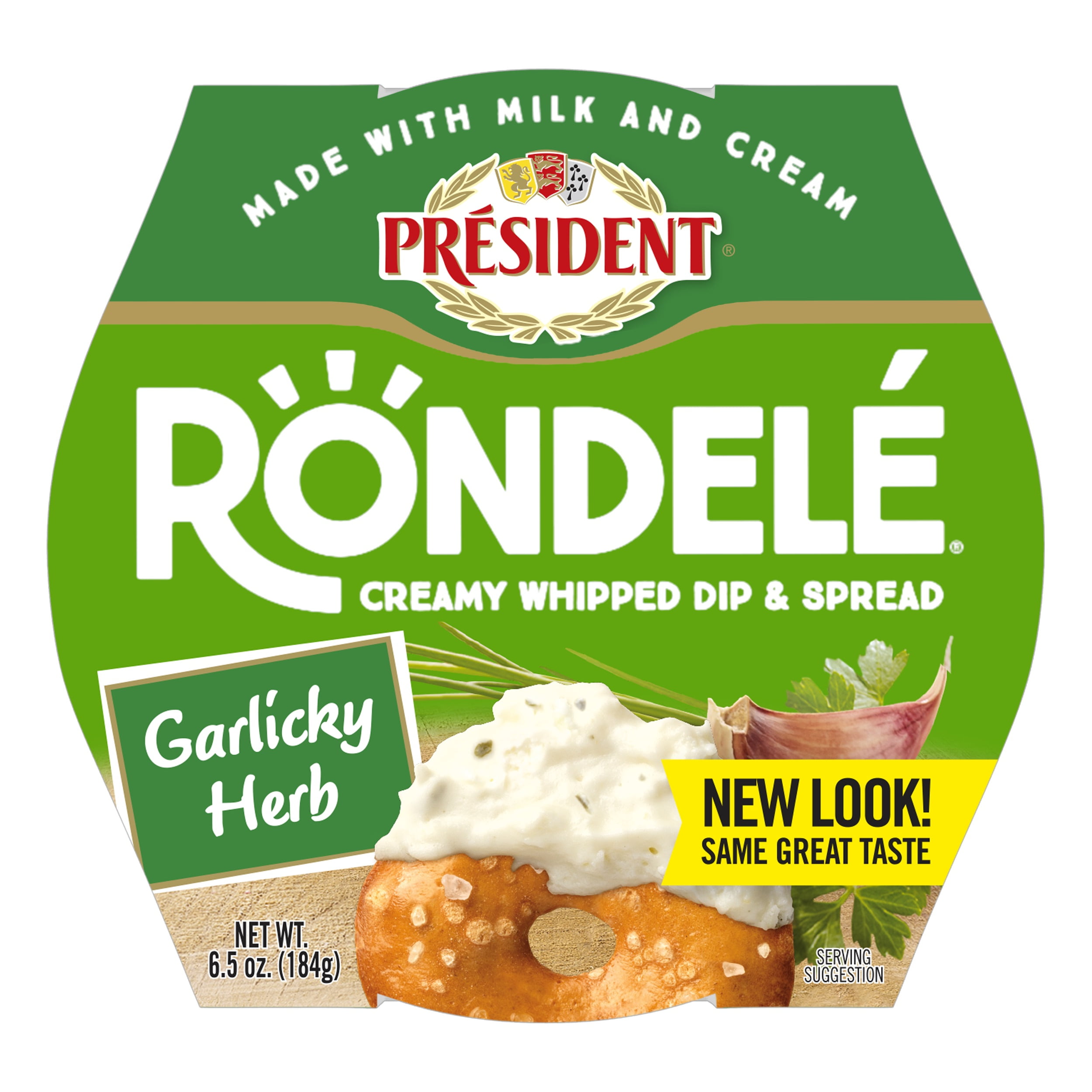 President Rondele Garlic and Herbs Gourmet Spreadable Cheese, 6.5 oz Tub (Refrigerated) Award-Winning Taste by President Cheese Packed in packaging with a resealable lid Whipped & Creamy Texture Rich and flavorful taste of garlic and herbs High Quality Ingredients Made with Milk and Cream Refrigerated product, sold in plastic tub packaging