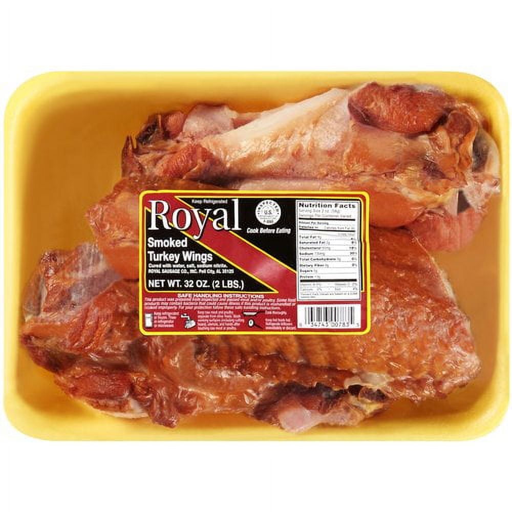 Create a delectable dinner with Royal Smoked Turkey Wings, cured, seasoned, and available in a 32-oz pack. USDA-inspected, they offer versatility: add to stews or soups for a rich flavor, bake or fry for a savory twist to lunches or weeknight meals. Enjoy them solo or with your favorite sides and vegetables. These gluten-free wings boast 13g of protein per serving, making them a wholesome addition to any meal.