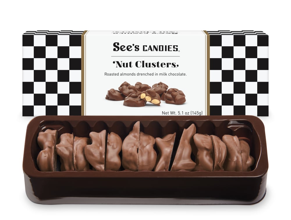 Almonds, cashews, peanuts, pecans & walnuts in milk chocolate. 4 flavors. Milk chocolate pecan & walnut cluster. Milk chocolate cashew cluster. Milk chocolate peanut cluster. Milk chocolate almond cluster. New. Improved assortment. An American classic est 1923. Our fresh and carefully roasted nuts ensure we have the best possible taste, texture and crunch before covering them with smooth, delicious chocolate for the perfect finish. Made from our hearts with tradition & passion. Guarantee of quality...