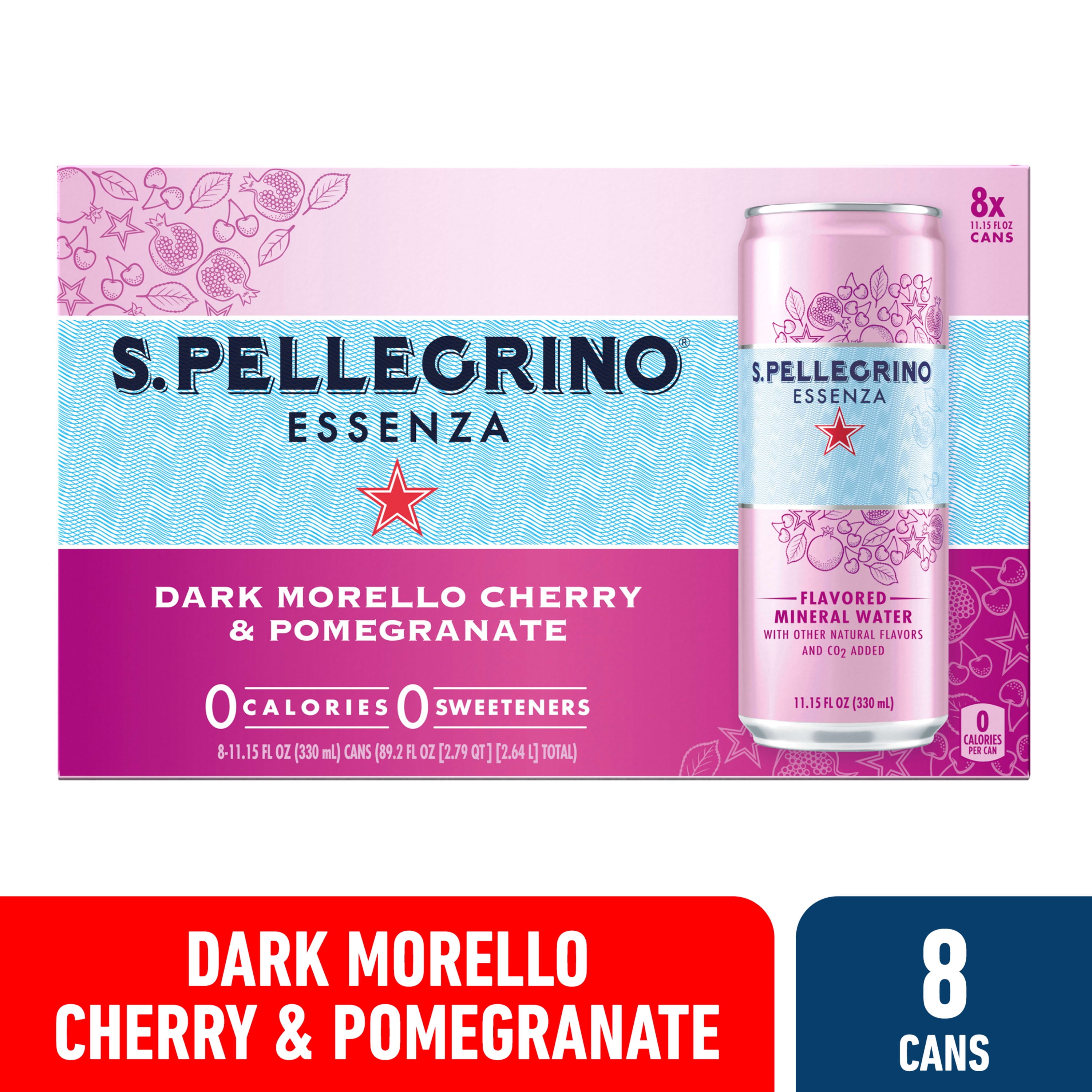 Includes eight 11.15 fl oz cans of S.Pellegrino Essenza Dark Morello Cherry & Pomegranate Flavored Mineral Water with CO2 Added Features gently carbonated water, mixed with a vibrant blend of Mediterranean fruit flavors This case of water pairs well with more flavorful dishes such as roasted vegetables, premium red meats, rich sandwiches and chocolate desserts S.Pellegrino mineral water cans are convenient for storage at home or the office, or taking on-the-go Enhance your moments with S.Pellegrino Essenza flavored mineral water SNAP and EBT Eligible item